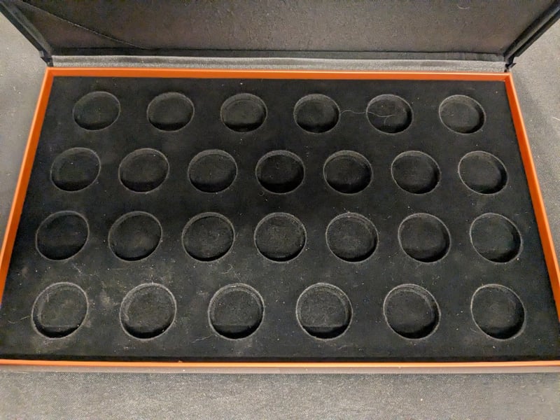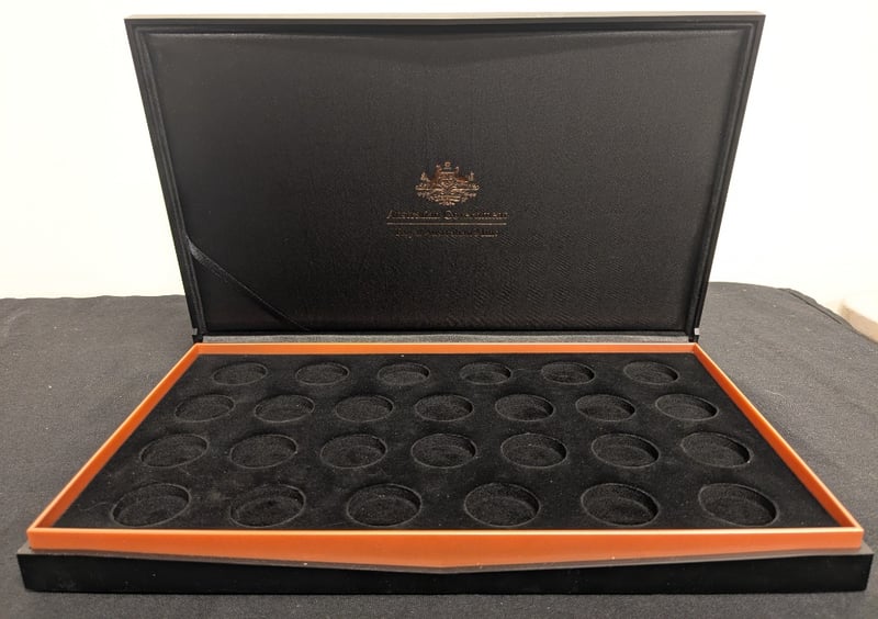 AUSTRALIAN COIN COLLECTION DISPLAY CASE - 24 COMPARTMENT PRESENTATION BOX Premium Presentation Case Featuring The Australian Coat Of Arms Emblem In Gold Foil On Black Lid. Elegant Two-Tone Design With Black Exterior And Vibrant Orange Interior Tray. Condition: Unc 584541+76