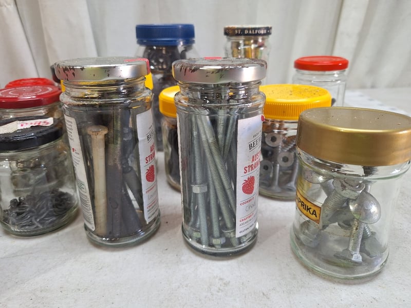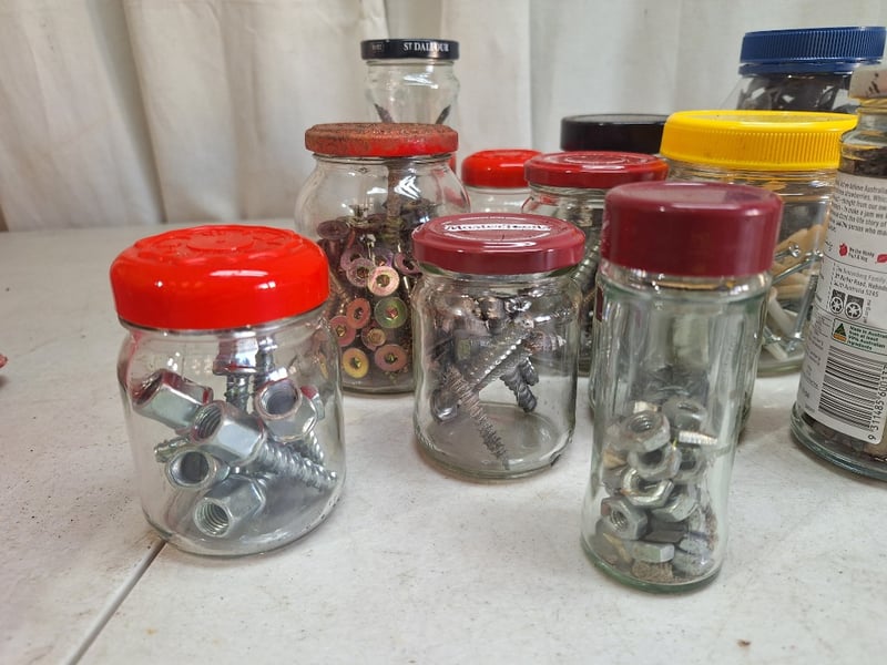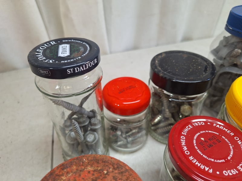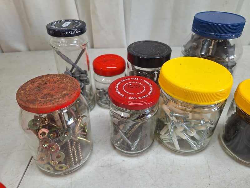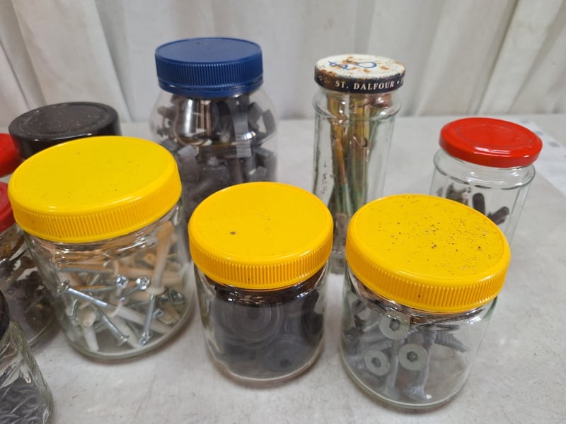 Jars Contain Assorted Hardware Including Screws, Nuts, Bolts, & Fasteners Of Varying Sizes