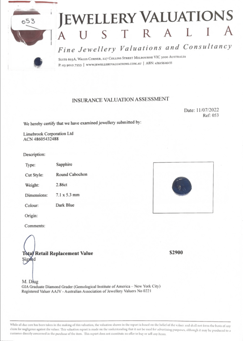 2.86CT ROUND BLUE SAPPHIRE. ADDITIONAL GIFT CARD $100, OURGIFT2U. Accompanied By Insurance Valuation Assessment And Additional $100 Gift Card, Ourgift2U. Cut Style: Round Cabochon. Colour: Dark Blue. Dimensions: 7.1 X 5.3Mm. Condition: Good - Refer To Images This valuation has been conducted by an independent third-party professional. The valuation amount is an assessment by the issuing valuer and does not reflect the auction value of the item. Any inquiries regarding the valuation should be directed to the issuing valuer (refer to contact details on the certificate), as Lloyds Auctions has no affiliation or influence over the valuation, the valuer, or the stated amount. Insurance Replacement Valuation Amount: $2,900.00 FC 162991+32