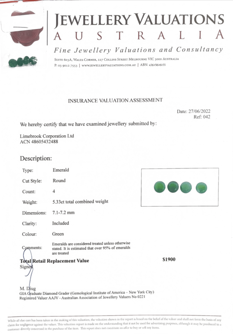 5.33TCW ROUND EMERALD. ADDITIONAL GIFT CARD $100, OURGIFT2U. Accompanied By Insurance Valuation Assessment And $100 Gift Card, Ourgift2U. Count: 4. Dimensions: 7.1 - 7.2Mm. Clarity: Included. Colour: Green. Condition: Good - Refer To Images This valuation has been conducted by an independent third-party professional. The valuation amount is an assessment by the issuing valuer and does not reflect the auction value of the item. Any inquiries regarding the valuation should be directed to the issuing valuer (refer to contact details on the certificate), as Lloyds Auctions has no affiliation or influence over the valuation, the valuer, or the stated amount. Insurance Replacement Valuation Amount: $1,900.00 FC 162991+34