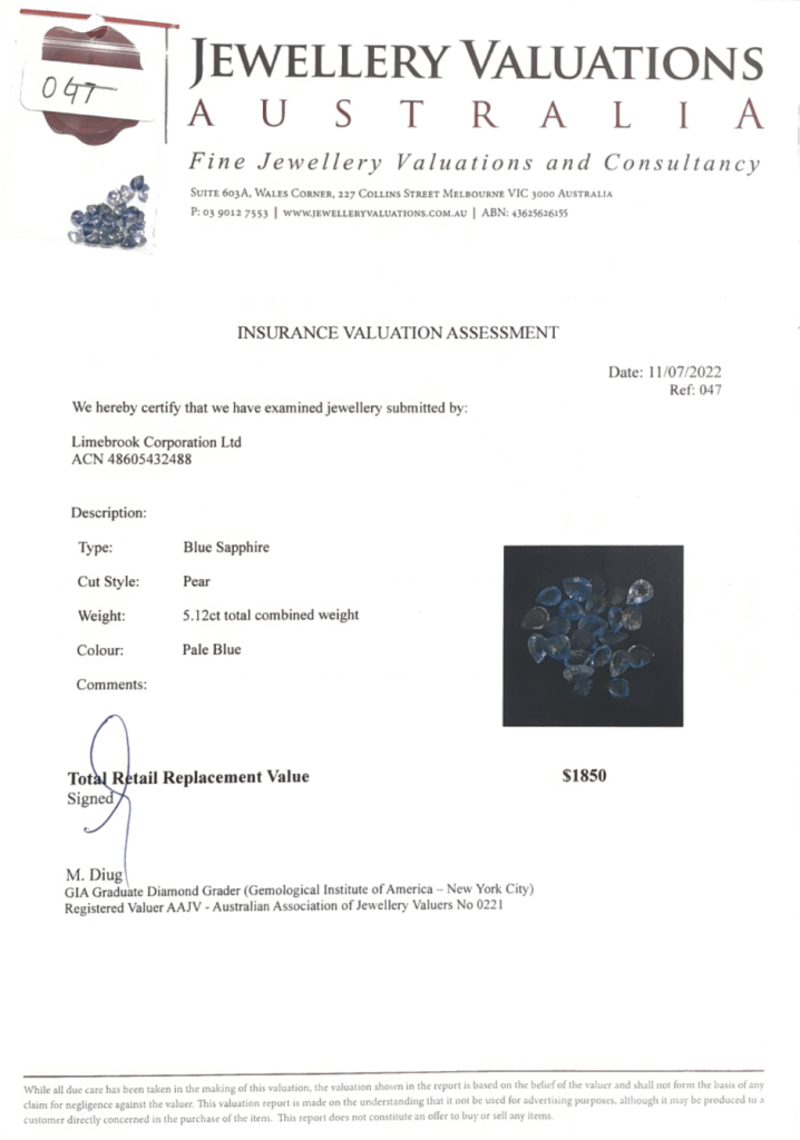 5.12TCW BLUE SAPPHIRES. ADDITIONAL GIFT CARD $100, OURGIFT2U. Accompanied By Insurance Valuation Assessment And Additional Gift Card $100, Ourgift2U. Cut Style: Pear. Colour: Pale Blue. Condition: Good - Refer To Images This valuation has been conducted by an independent third-party professional. The valuation amount is an assessment by the issuing valuer and does not reflect the auction value of the item. Any inquiries regarding the valuation should be directed to the issuing valuer (refer to contact details on the certificate), as Lloyds Auctions has no affiliation or influence over the valuation, the valuer, or the stated amount. Insurance Replacement Valuation Amount: $1,850.00 FC 162991+28