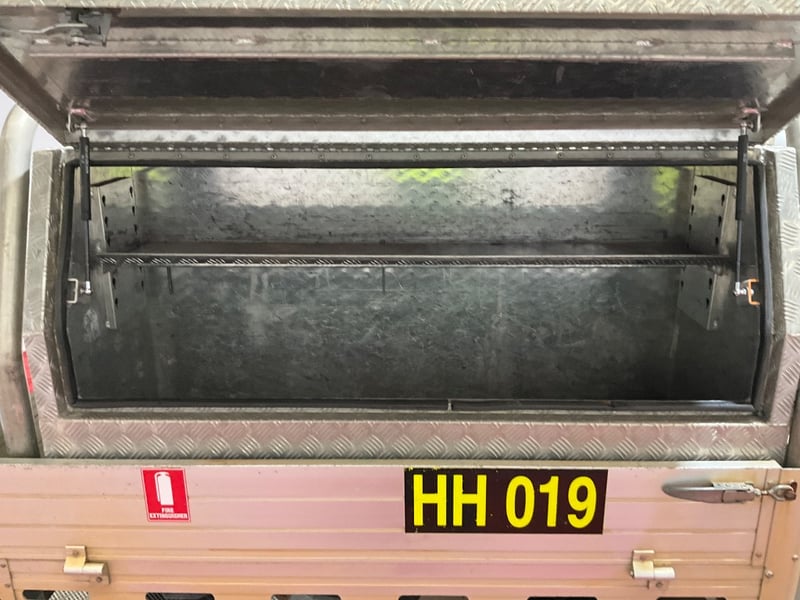 Vinyl floor, ar seat covers, roof racks, yellows beacon on roof, large lockable tool box, fire extinguisher, Aluminum tray, multi functionality steering wheel, tow ball, two way radio, reverse speaker