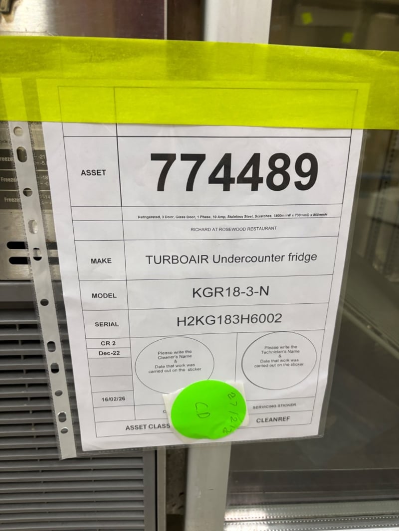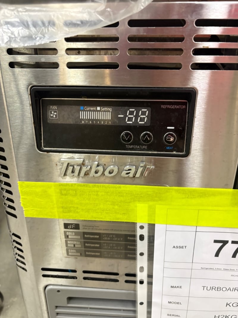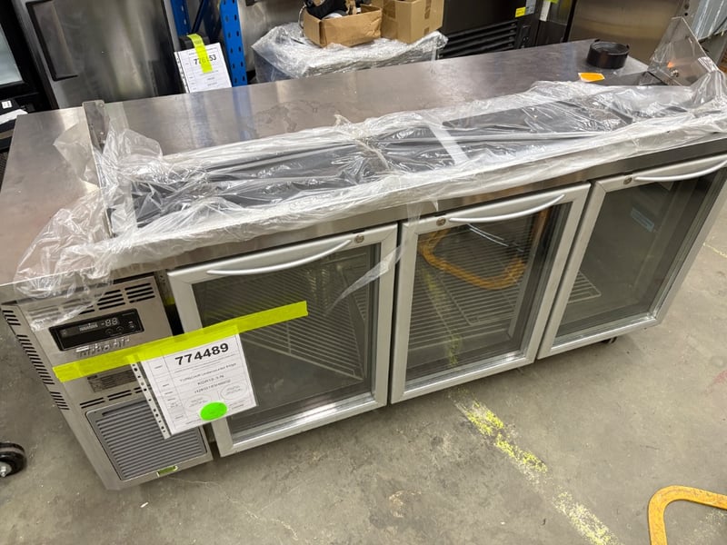 TURBOAIR Undercounter Fridge, Refrigerated, 3 Door, Glass Door, 1 Phase, 10 Amp, Stainless Steel, ScratchesModel: KGR18-3-NDimensions: 1800mmW x 730mmD x 860mmH