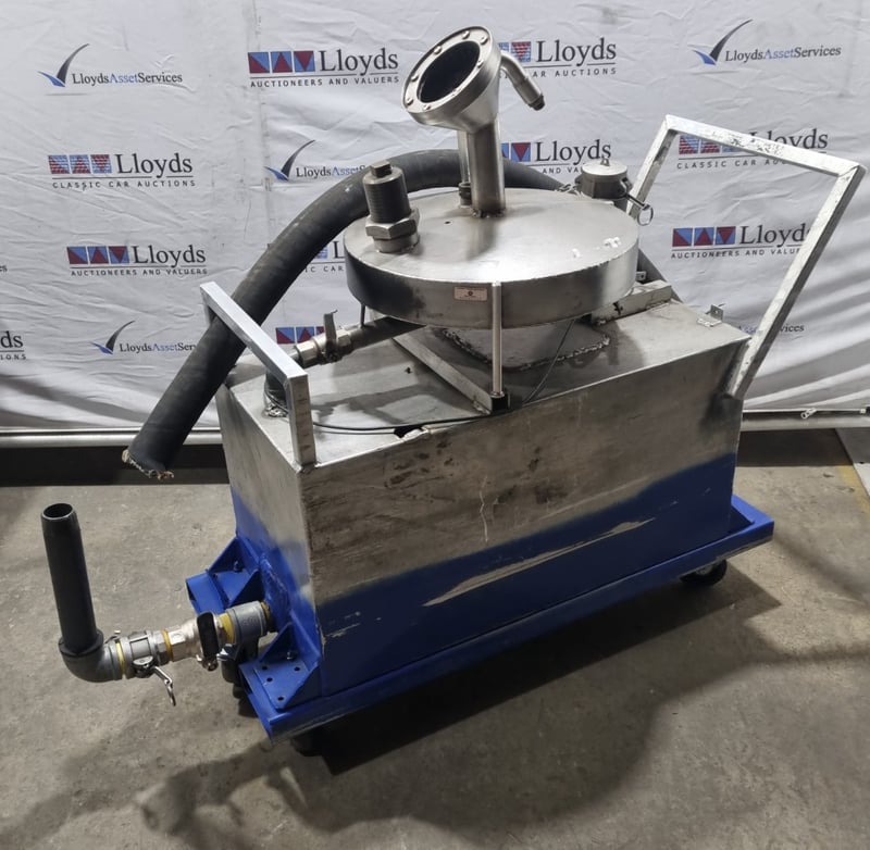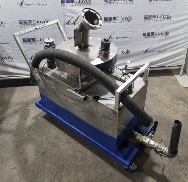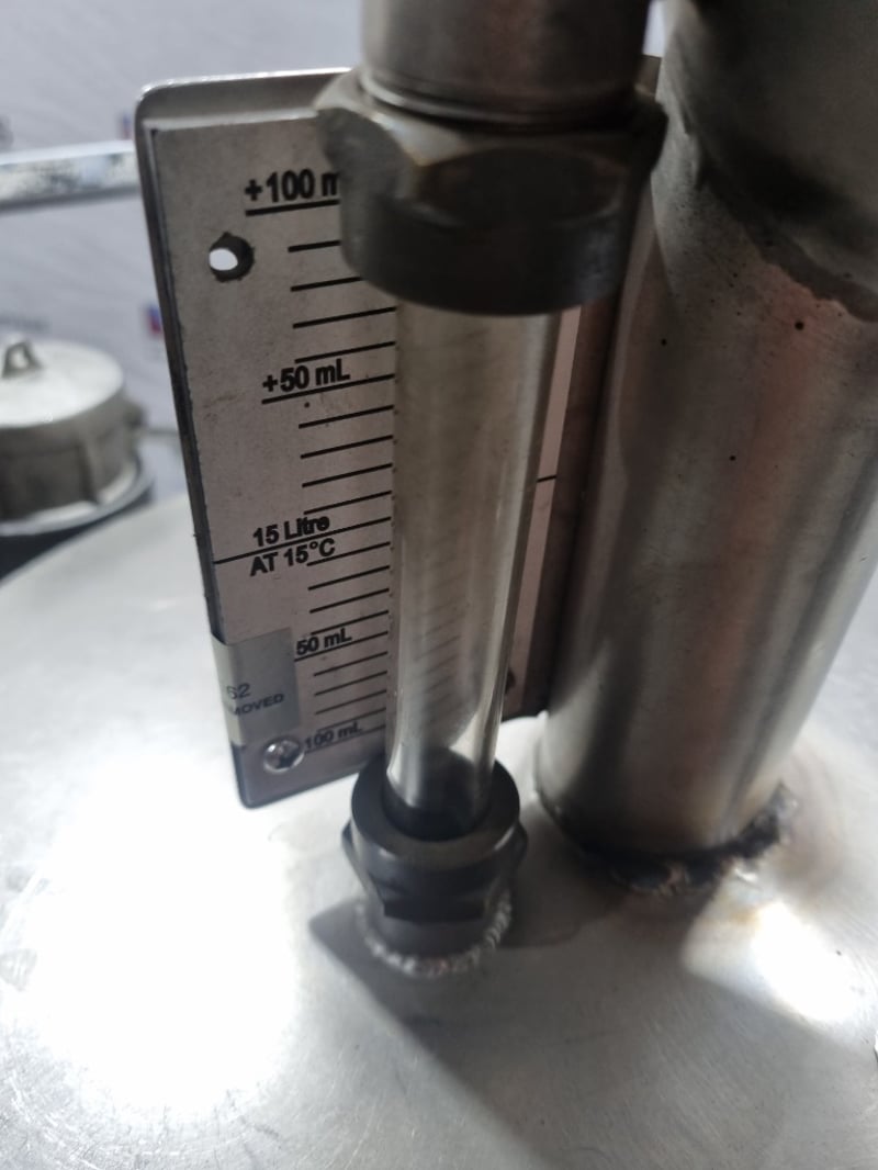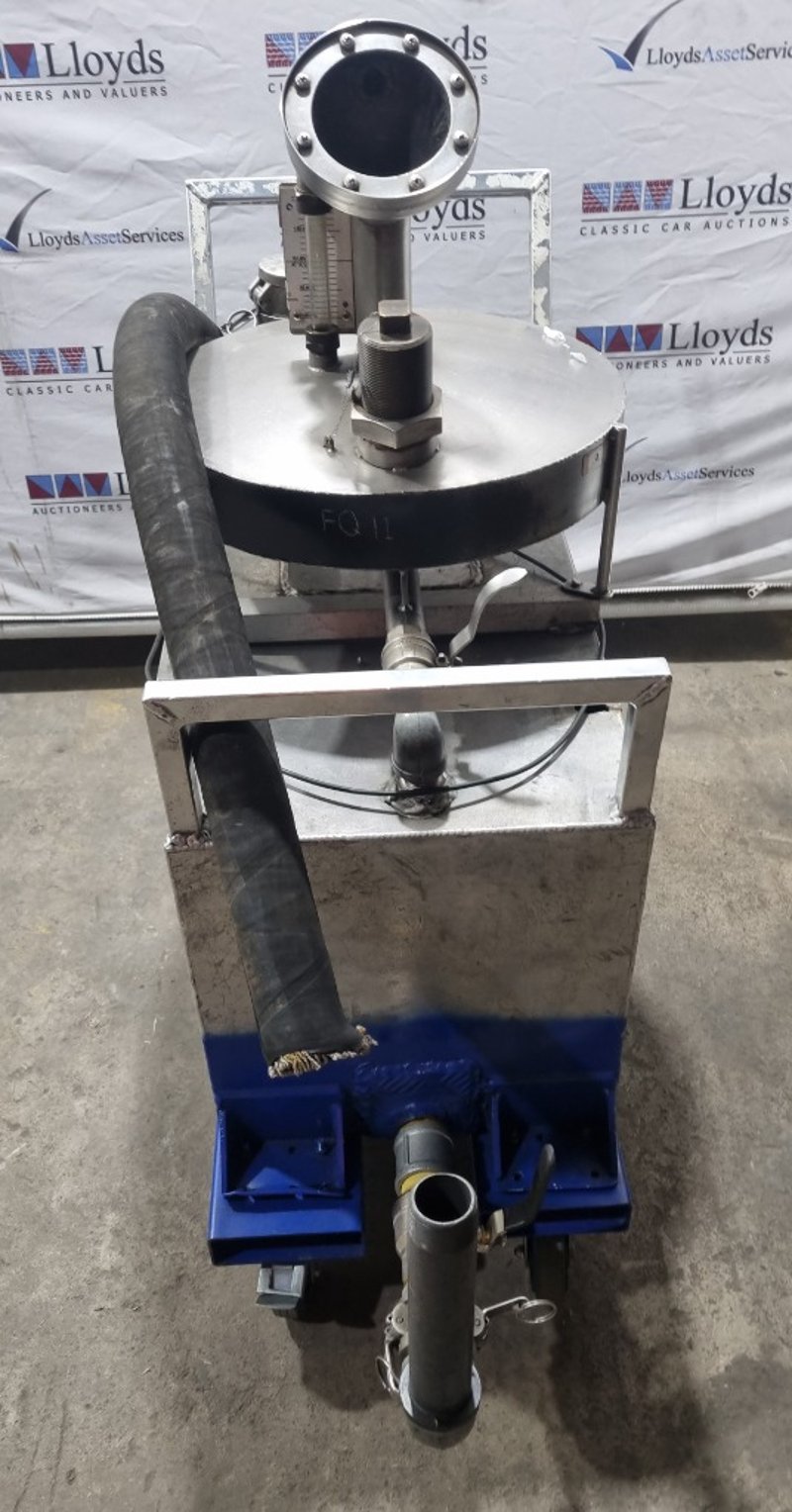 Industrial stainless steel pressure vessel mounted on a mobile blue base frame. Features a cylindrical main tank with dished top and bottom, fitted with multiple connection points including a prominent top-mounted sight glass with scale markings (0-15 Litres at 15°C, +60mL, +100mL graduations). Equipped with pressure relief valve, inlet/outlet pipework with brass couplings, and manual drain valve. The unit includes a safety vent line and appears to be a precision measuring or storage apparatus. Stamped reference "EQ11" visible on upper band. Base frame incorporates robust welded construction with integrated lifting lugs. Comprehensive piping configuration suggests use in laboratory, industrial testing, or automotive applications.