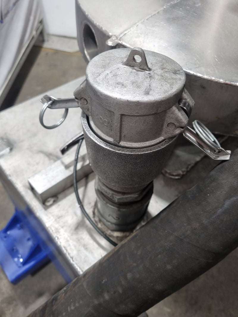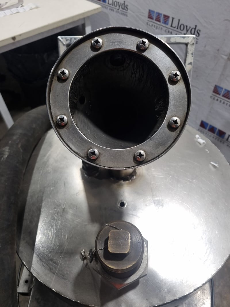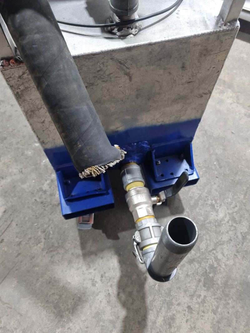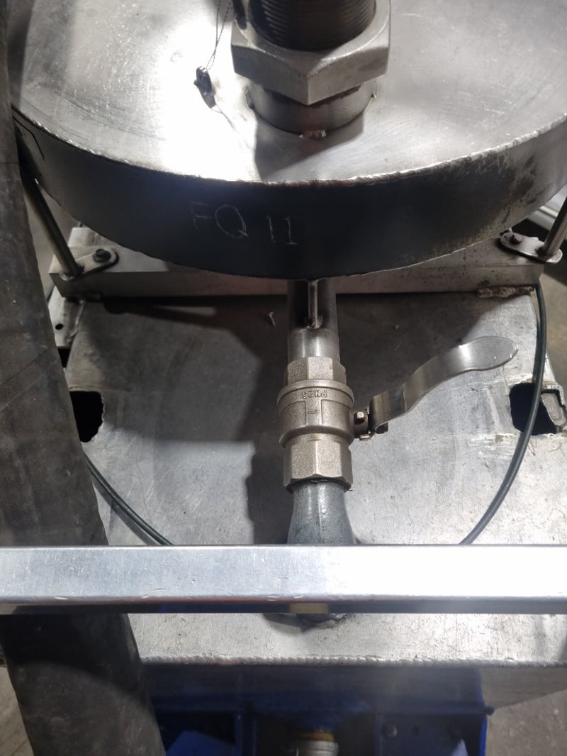 Industrial stainless steel pressure vessel mounted on a mobile blue base frame. Features a cylindrical main tank with dished top and bottom, fitted with multiple connection points including a prominent top-mounted sight glass with scale markings (0-15 Litres at 15°C, +60mL, +100mL graduations). Equipped with pressure relief valve, inlet/outlet pipework with brass couplings, and manual drain valve. The unit includes a safety vent line and appears to be a precision measuring or storage apparatus. Stamped reference "EQ11" visible on upper band. Base frame incorporates robust welded construction with integrated lifting lugs. Comprehensive piping configuration suggests use in laboratory, industrial testing, or automotive applications.