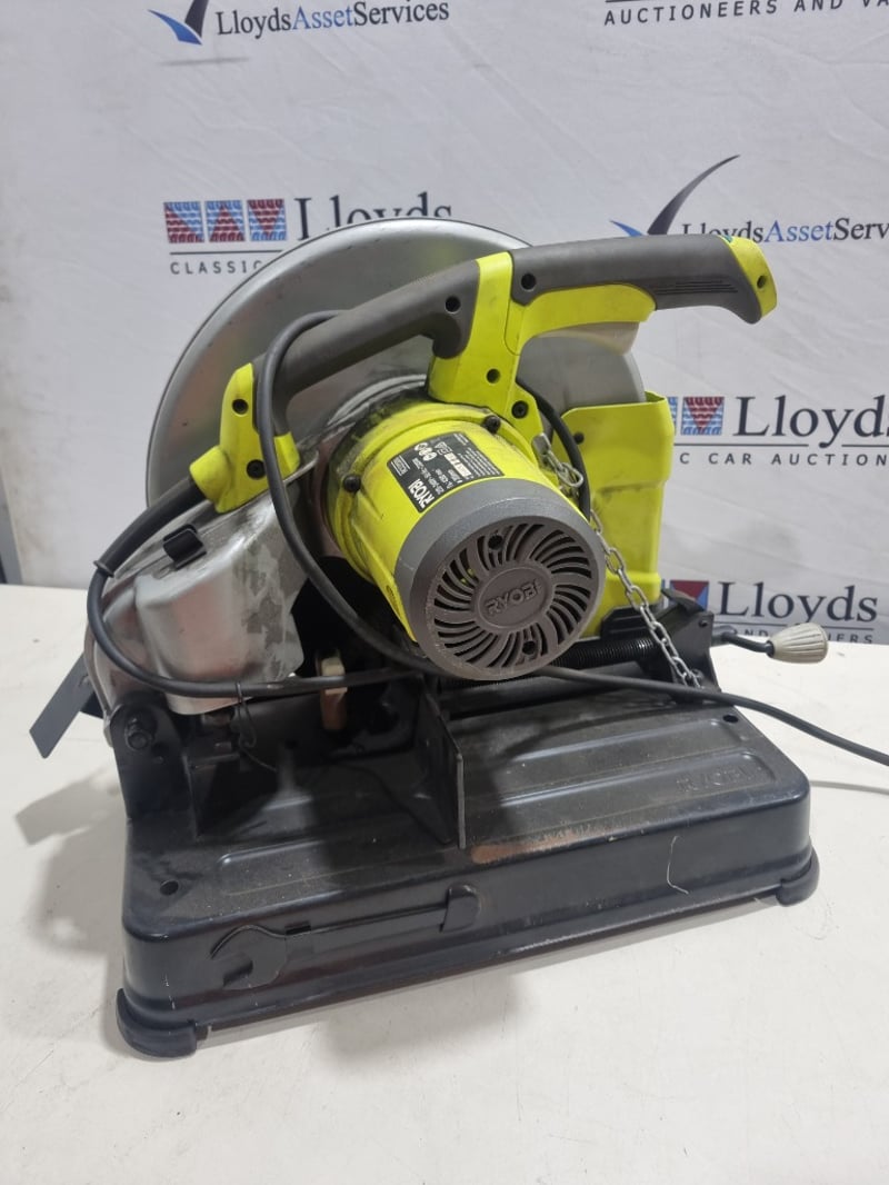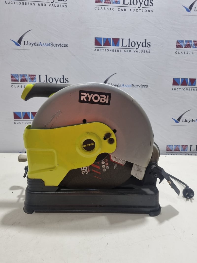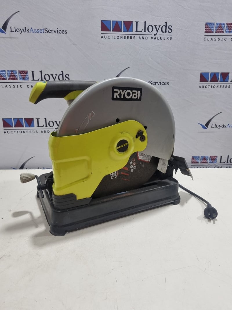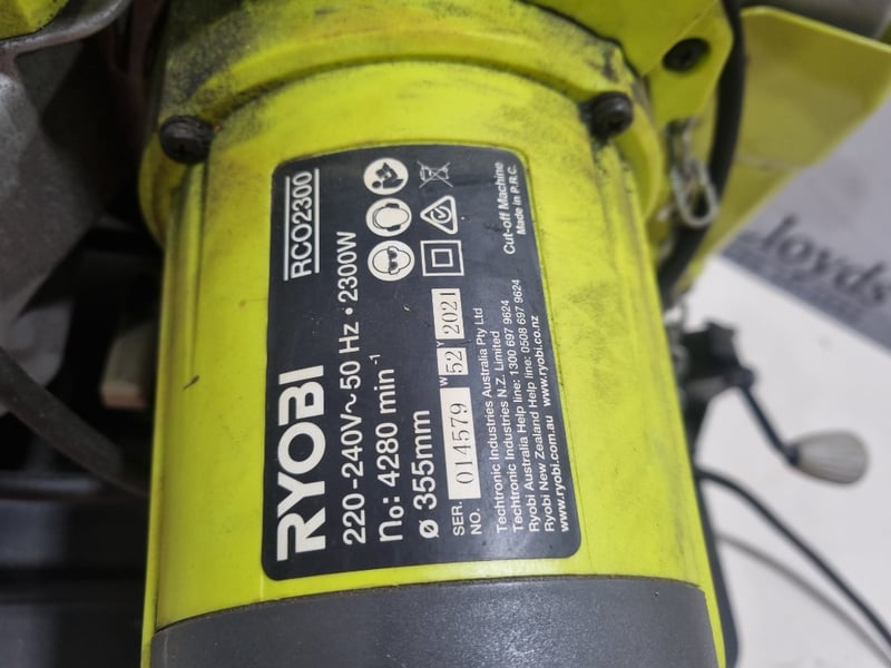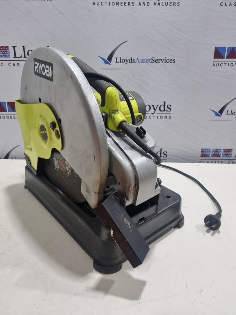 RYOBI RCS2340 Electric Chop Saw. Features a 2300W motor operating at 220-240V, 50Hz with 4280 min?¹ no-load speed and 355mm cutting diameter. Includes grey cutting disc and yellow protective guard. Mounted on black base platform with power cord. Note: untested,signs of wear