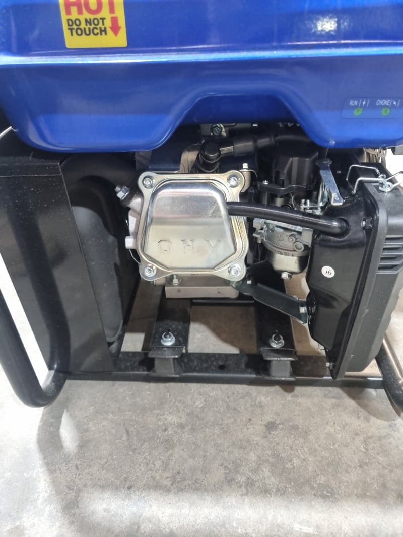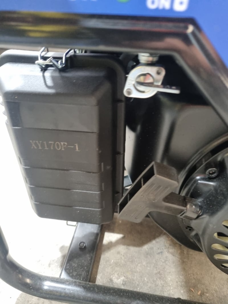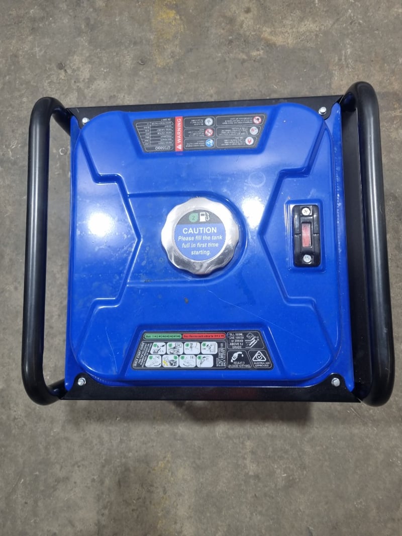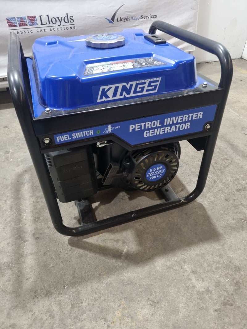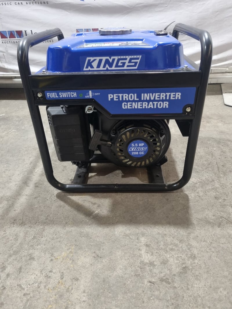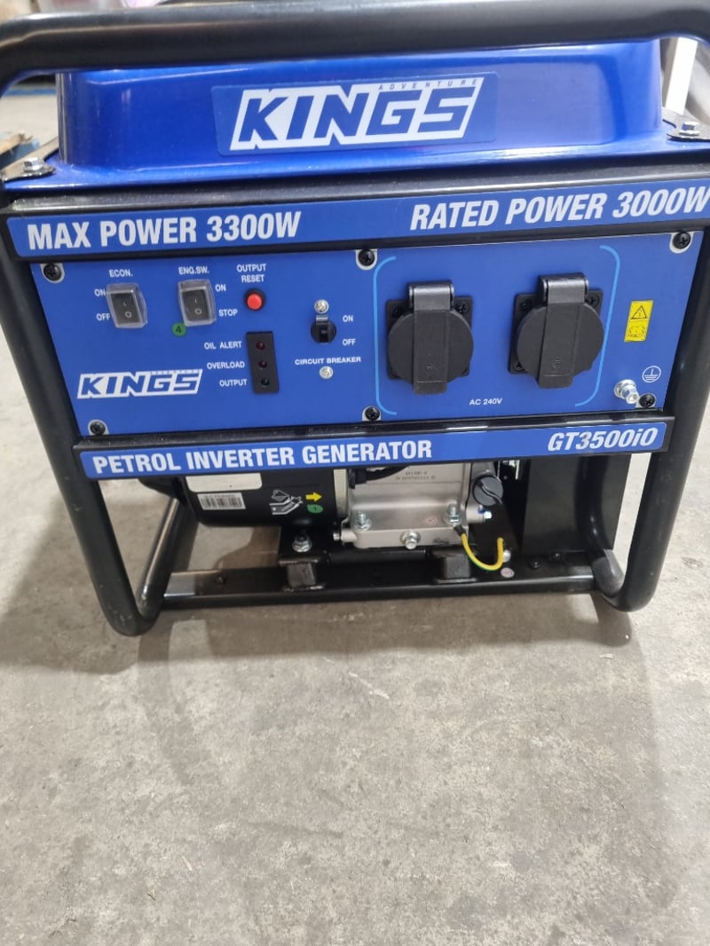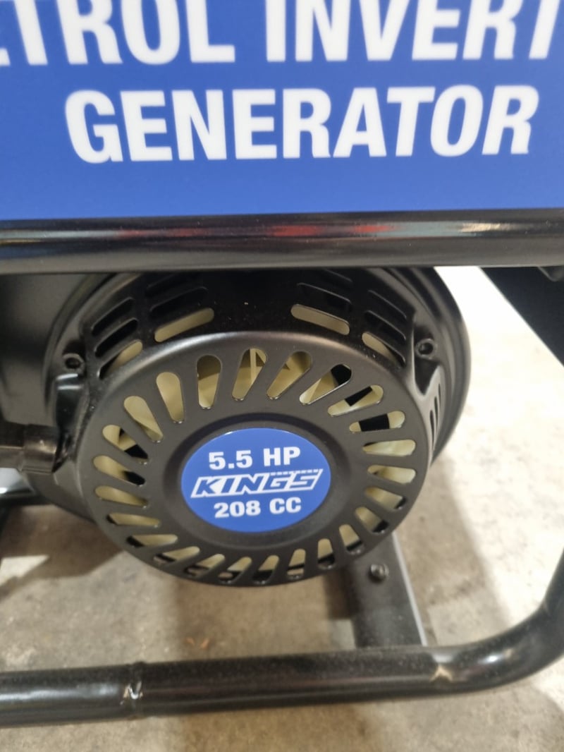 Kings petrol inverter generator featuring a 5.5 HP, 208cc engine with fuel switch control. This portable power unit delivers maximum output of 3300W with rated power of 3000W, making it suitable for various applications including camping, outdoor events, and emergency backup power. The inverter technology ensures clean, stable power for sensitive electronics. Unit includes comprehensive safety features with oil alert monitoring, overload protection, and circuit breaker control. Twin AC 240V outlets (AC-240V) enable simultaneous device operation. The robust frame incorporates sturdy black handles for transport and stability. Control panel features economy mode (ECON) switch, engine shutdown (ENGN/SW), output reset functionality, and fuel indicator gauge. Includes professional-grade specifications with XY170F-1 fuel tank assembly. Note: untested,signs of wear