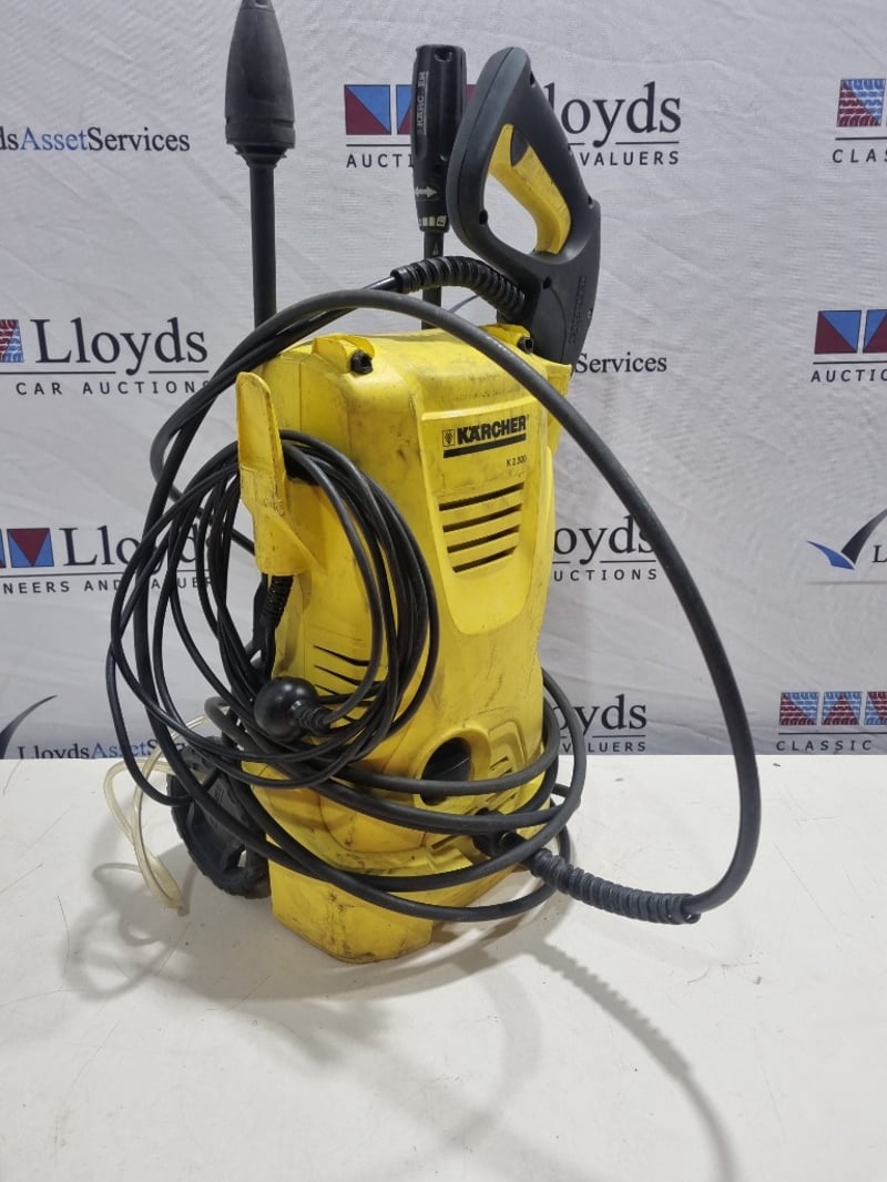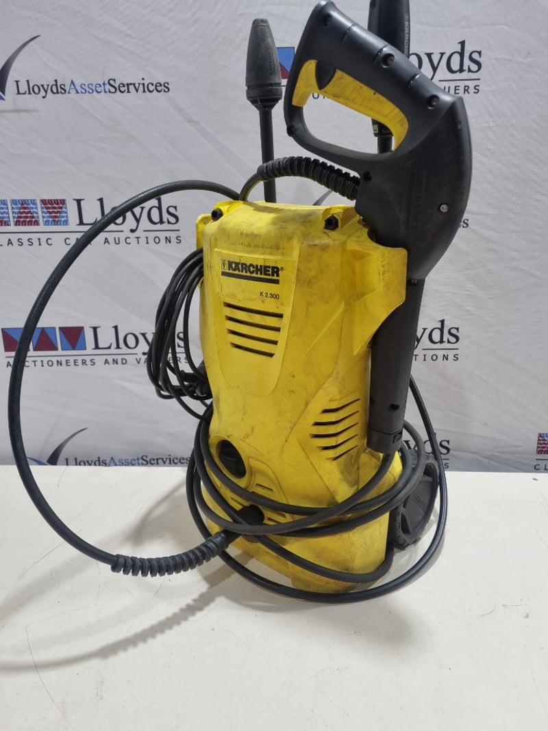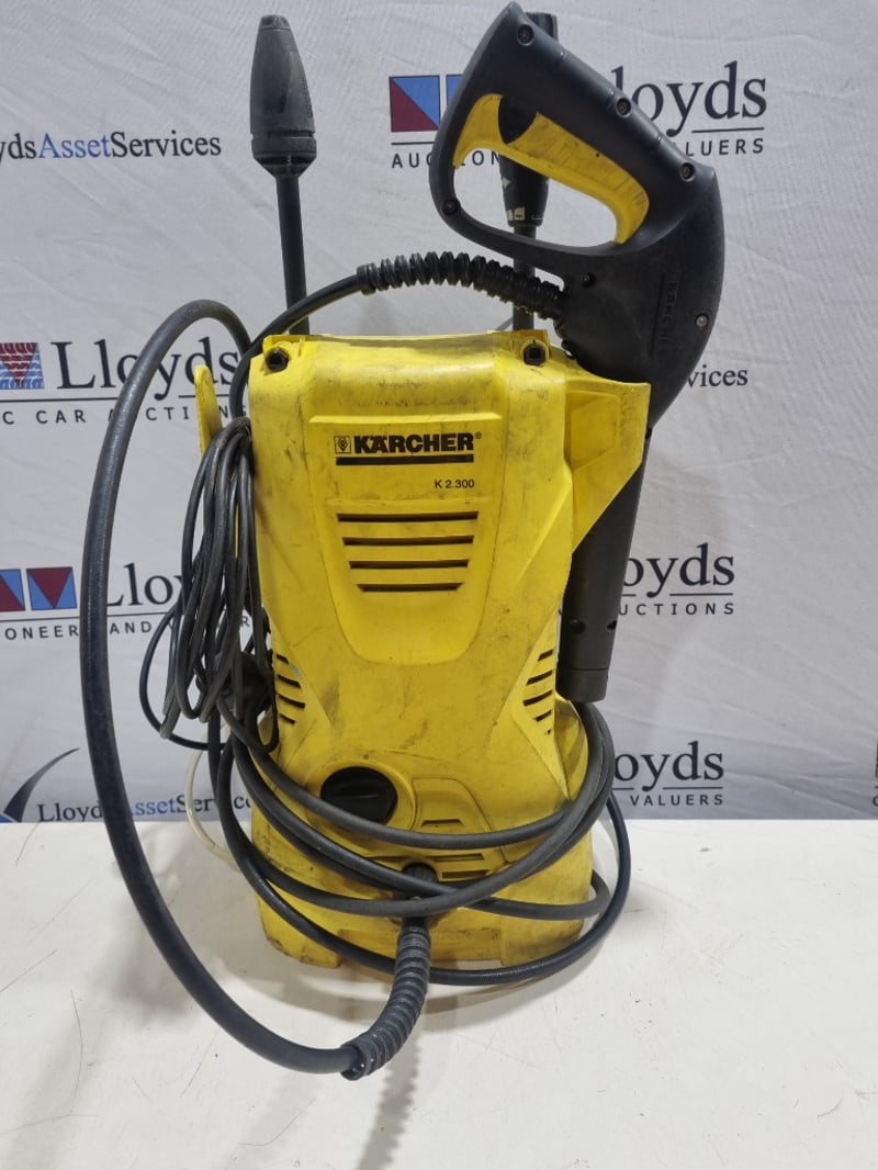Kärcher K 2300 electric pressure washer in distinctive yellow and black coloring. Compact unit featuring a 1400W motor designed for light to medium domestic cleaning tasks. Equipment includes black high-pressure hose with reinforced construction and adjustable spray gun with yellow grip handle. The unit is mounted on integrated wheels for mobility. Note: untested,signs of wear