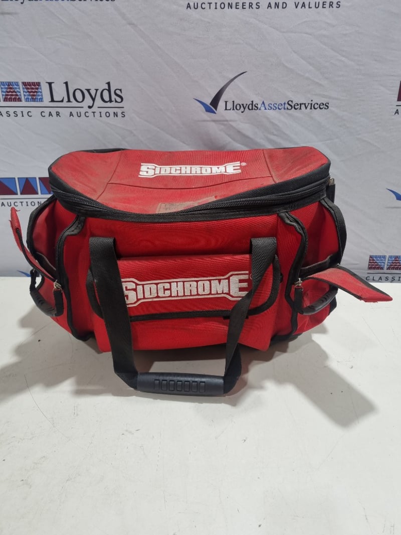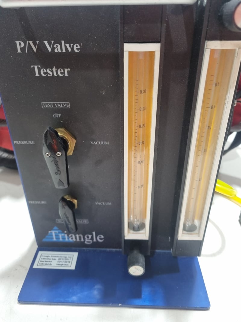 Sidchrome tool kit comprising a Triangle Manufacturing P/V Valve Tester with dual manometer gauges (pressure/vacuum), accompanied by a Dwyer Series 475 Mark III digital manometer for precise pressure measurements. Kit includes yellow connecting hose and comes in original red Sidchrome canvas carry bag with black trim and multiple storage pockets. The valve tester features brass fittings, manual selector switch (pressure/vacuum/off), and two graduated glass tube gauges calibrated in standard units.