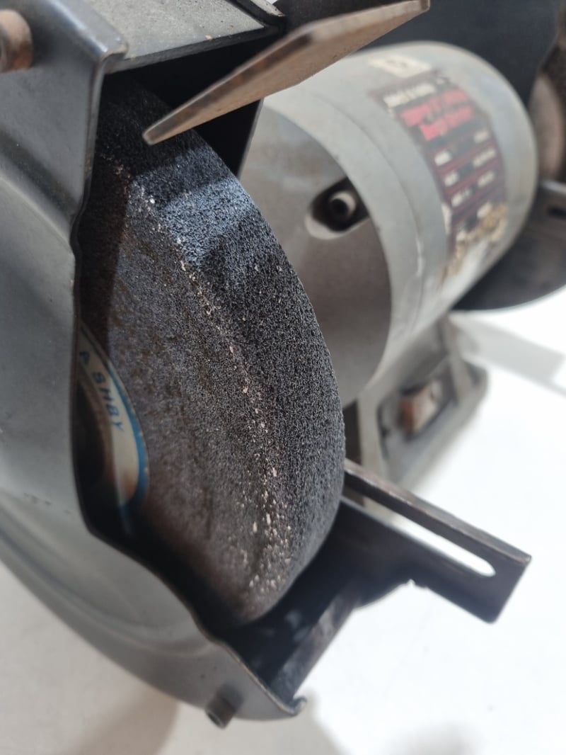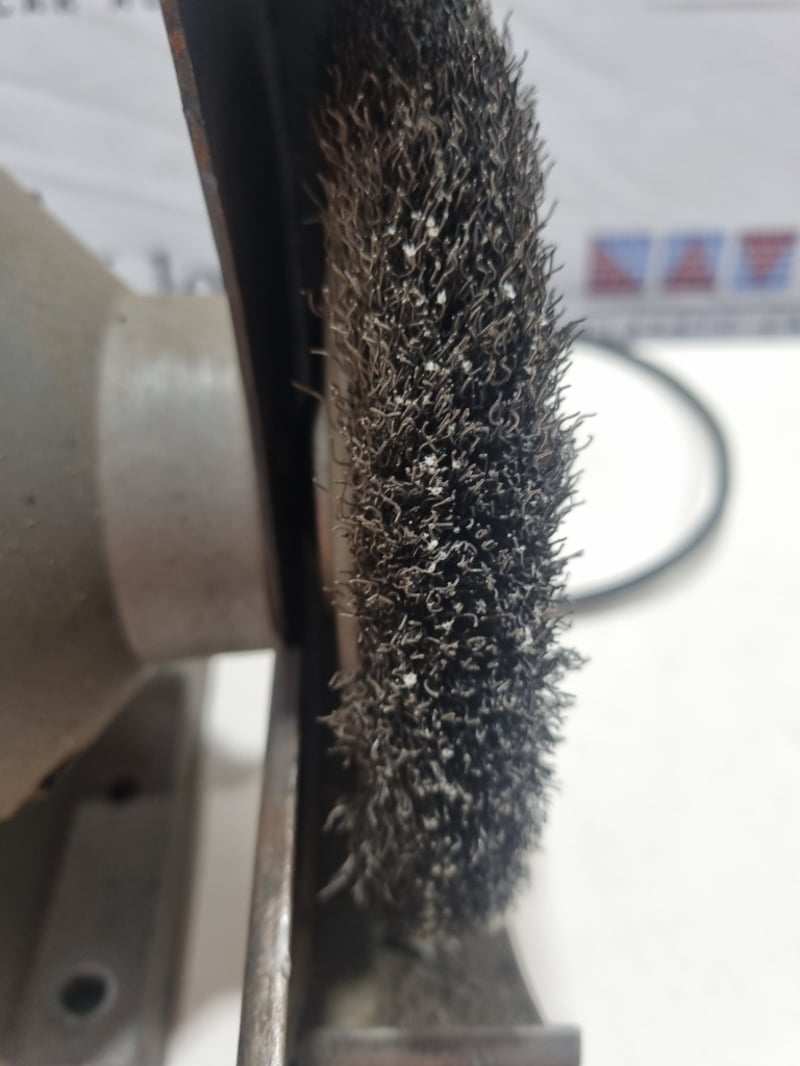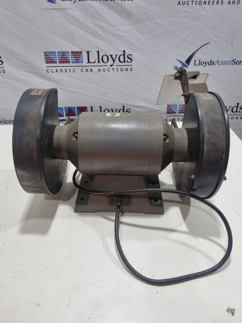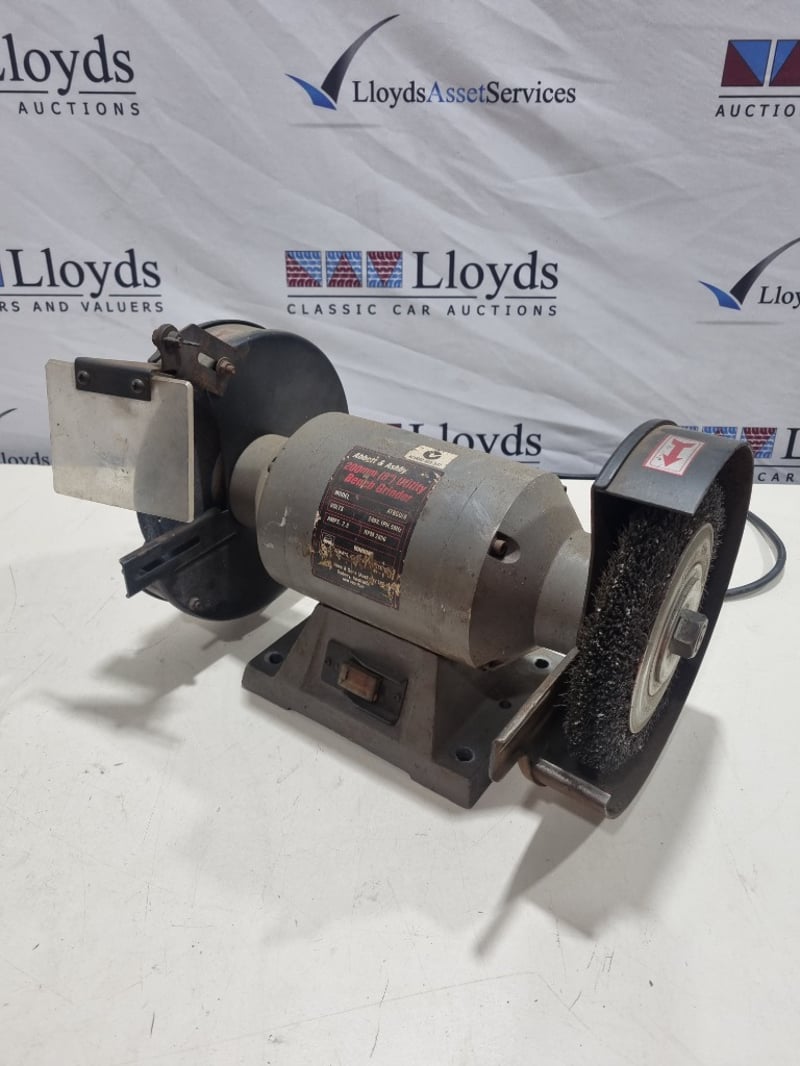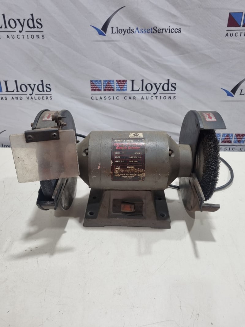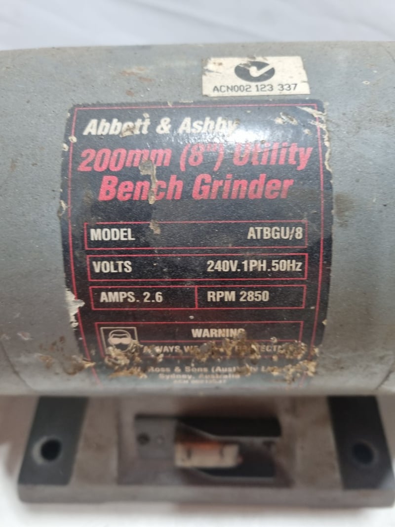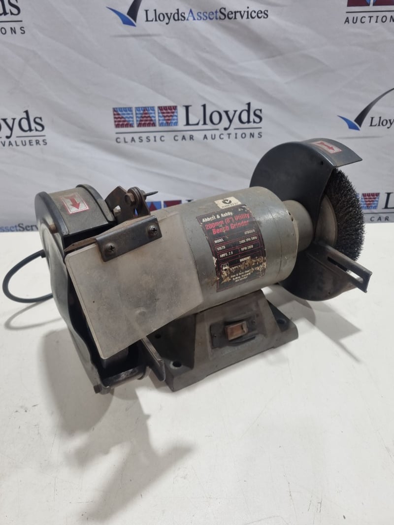 Abbott & Ashby 200mm (8") Utility Bench Grinder, Model ATBGU/8. Dual-wheel bench-mounted grinding station featuring 240V single-phase 50Hz motor with 2.6 amp capacity and 2850 RPM operation. Equipment includes original metal mounting base with integral power switch, paired with wire brush wheels and stone grinding wheels in moderate condition. The wheels show standard wear from workshop use with visible surface texture and bristle condition. Complete with power cable and operational framework. Suitable for tool sharpening and general metalworking applications in workshop or industrial settings.