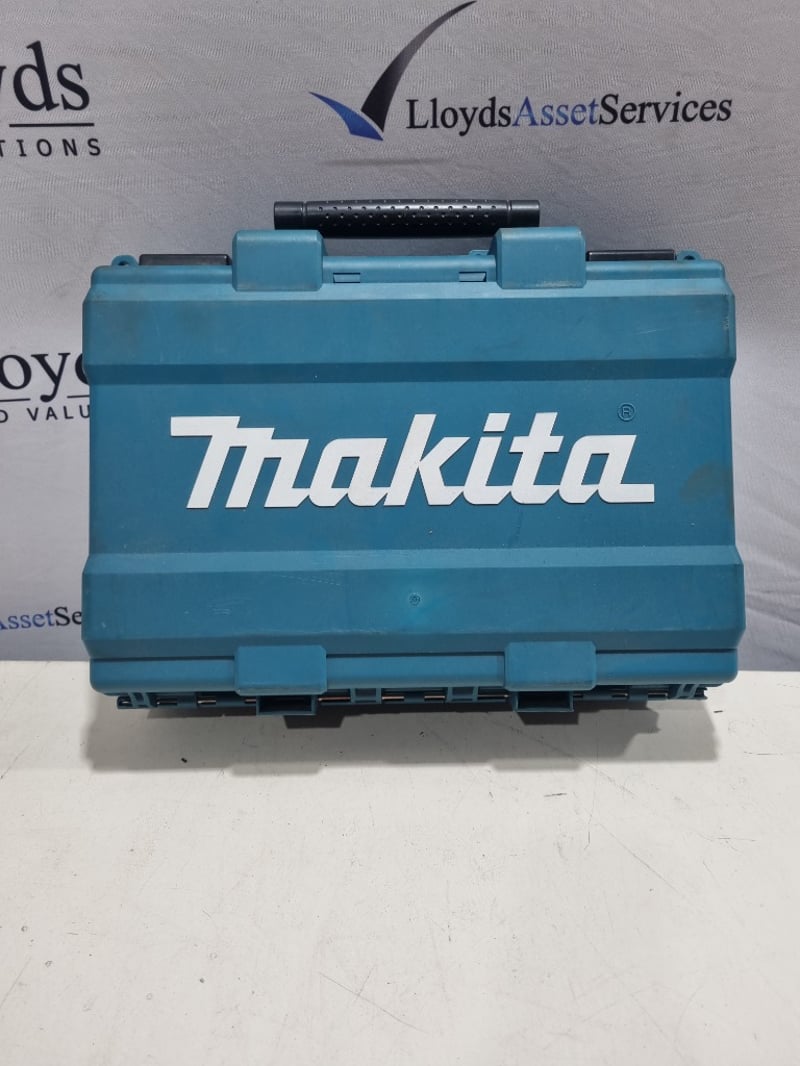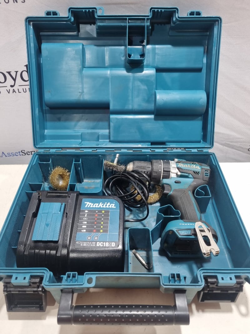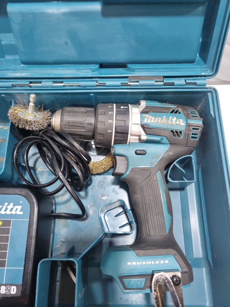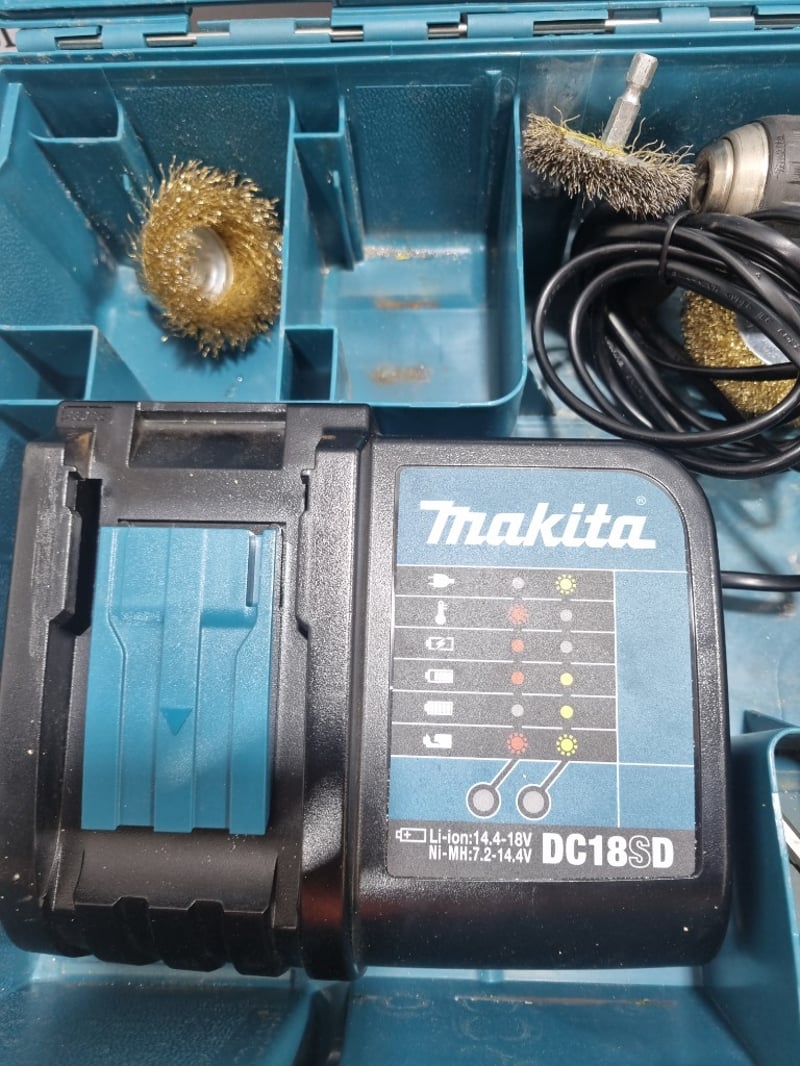 Makita 18V Cordless Drill/Driver Kit in original carry case. Complete with DC18SD dual-port charger, two brush-style cordless drill units, wire brush attachments, power cord, and organized foam-lined storage compartments. The kit includes all accessories shown and appears to be a professional-grade combo set suitable for drilling, fastening, and wire cleaning applications. Note: untested, signs of wear