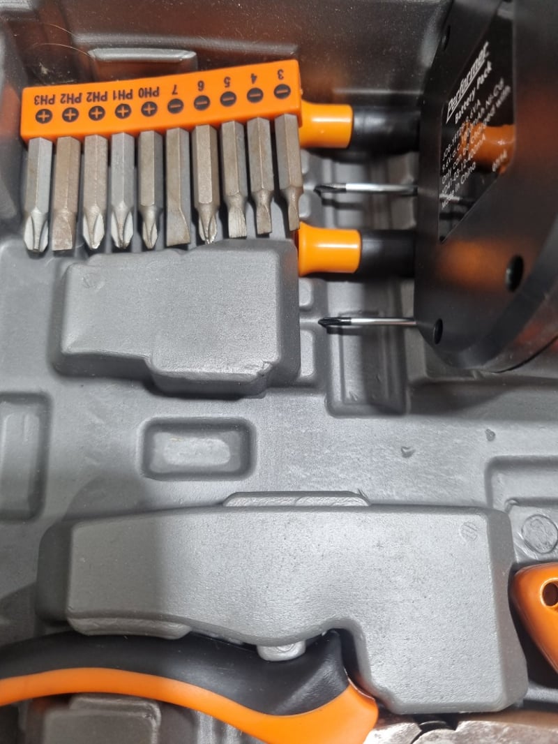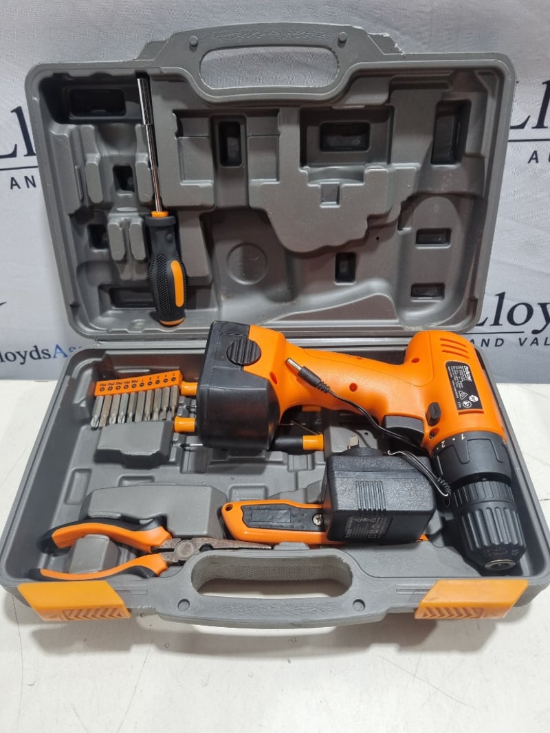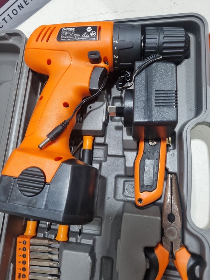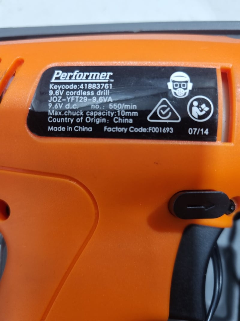 Performer 9.6V cordless drill kit (Model JOZ-YFT29-9.6VA) in grey carrying case with orange accents. Complete with 9.6V charger, 10mm chuck capacity, comprehensive bit set in orange holder with Phillips and flat head bits labeled up to CH4, adjustable clutch settings, and additional hand tools including pliers and screwdriver. Case features foam-lined interior with custom molded compartments for organized storage. Manufacturing date 07/14, made in China. Drill speed 550/min. Keycode 41883761.