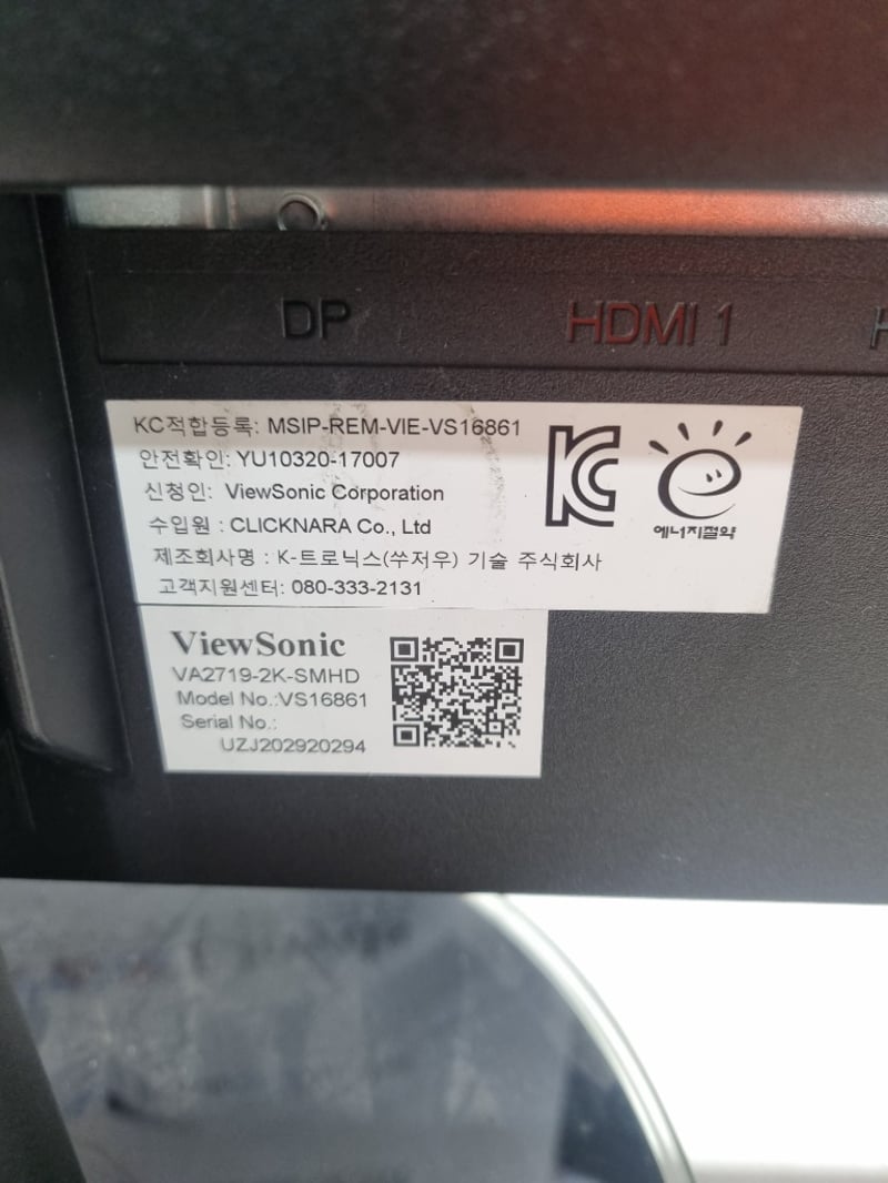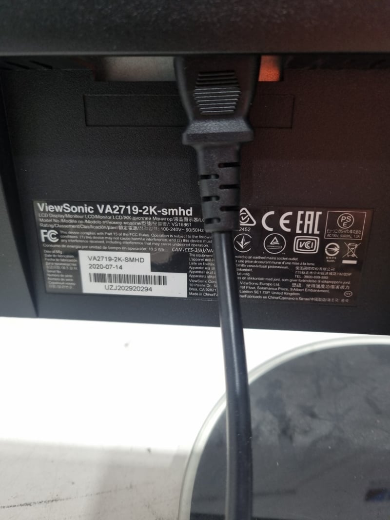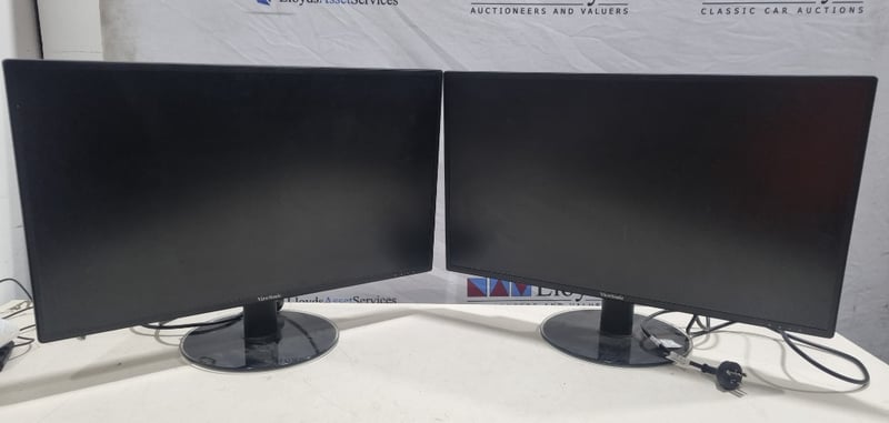 Pair of ViewSonic VA2719-2K-SMHD LCD monitors, model VS16861. Each monitor features a 27-inch display with 2560x1440 resolution and HDMI connectivity. Includes original power cables and stand bases. Monitors appear fully functional with clear displays. Ideal for dual-monitor setup for professional work, graphic design, or trading applications.serial numbers UZJ202920294.