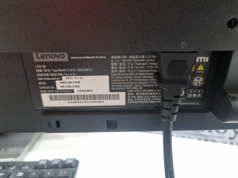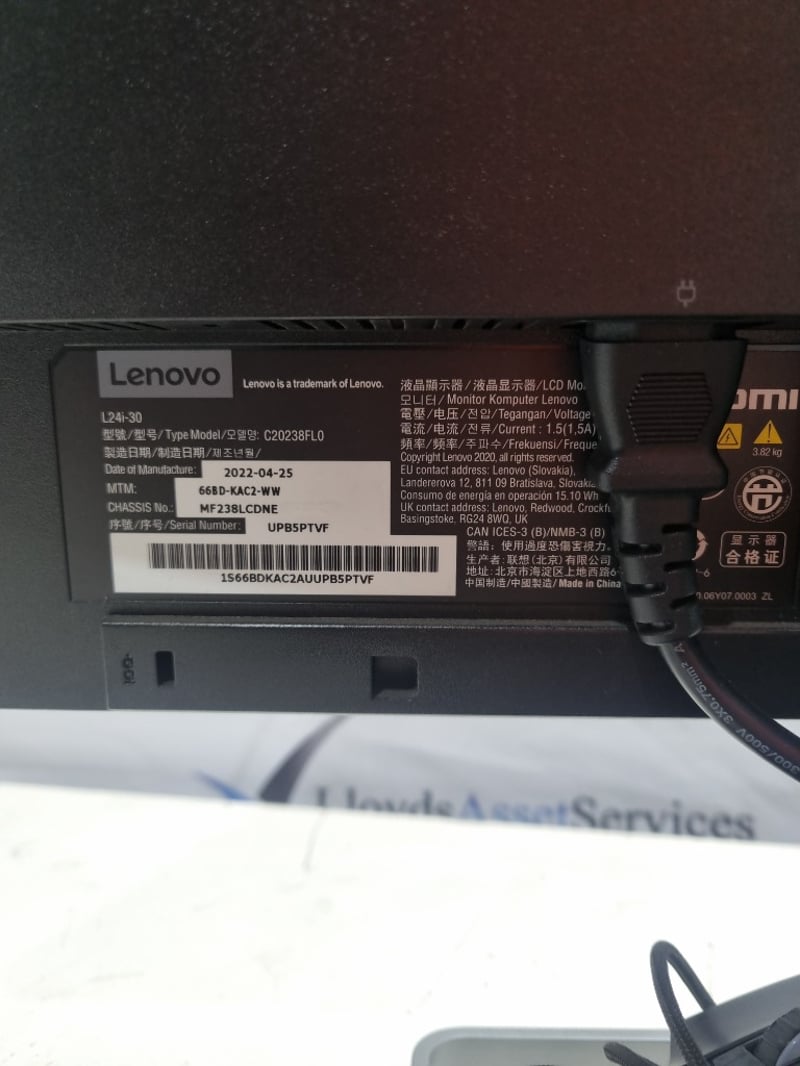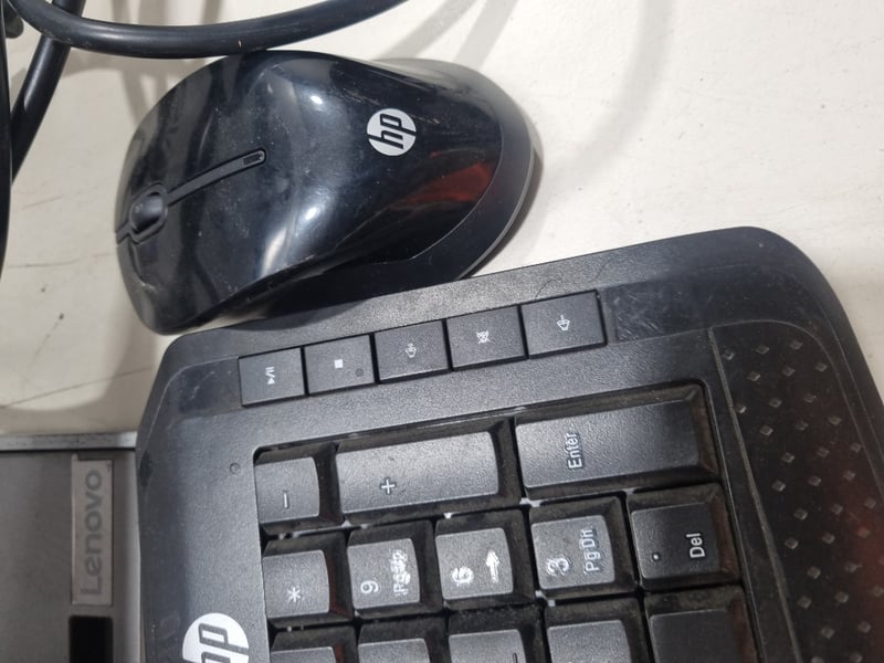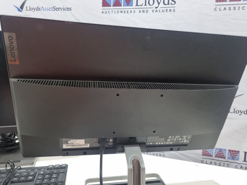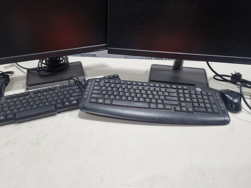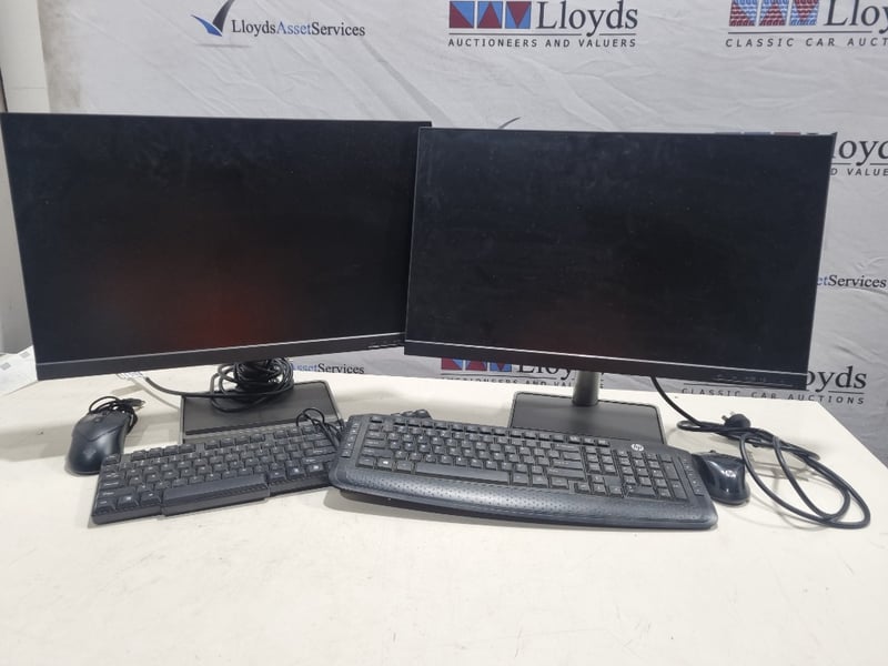 Dual monitor desktop computer setup comprising two Lenovo L24i-30 monitors (model C20238FL0, manufactured 2021-2022), paired with HP ergonomic keyboards and matching wired mice. The system includes two curved gaming-style keyboards with contoured palm rests and programmable buttons, complemented by precision optical mice featuring side buttons. Both monitors feature 24-inch displays with adjustable stands and standard connectivity ports. The setup demonstrates typical office or gaming workstation configuration with all peripheral devices included. Monitors show evidence of use with minor dust accumulation on bezels. All cables and power adapters present.