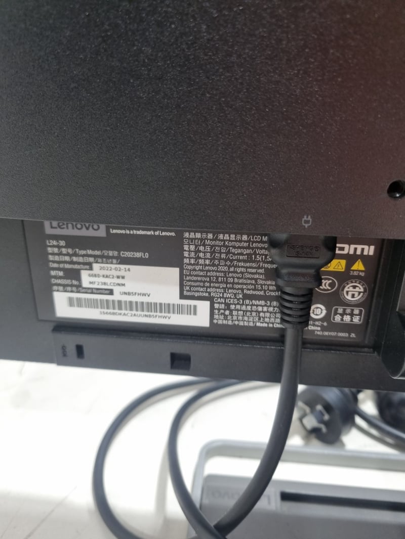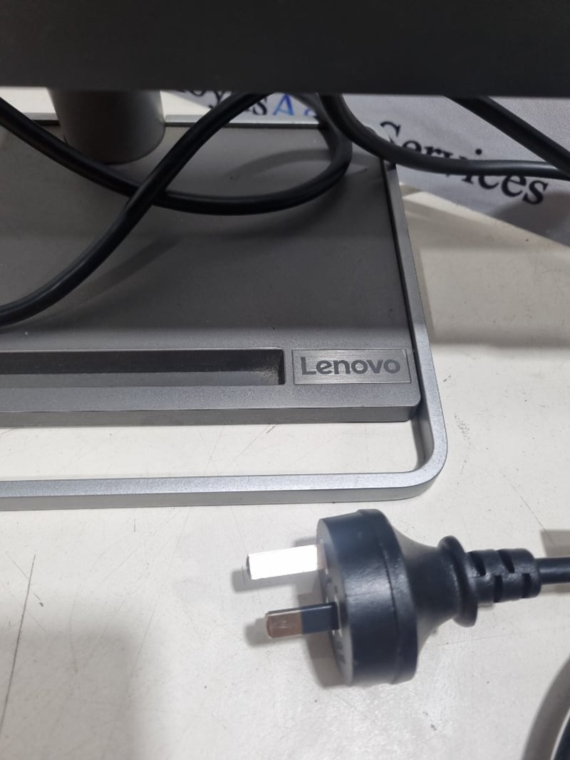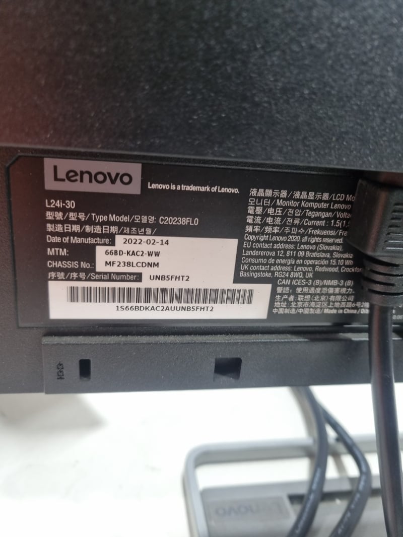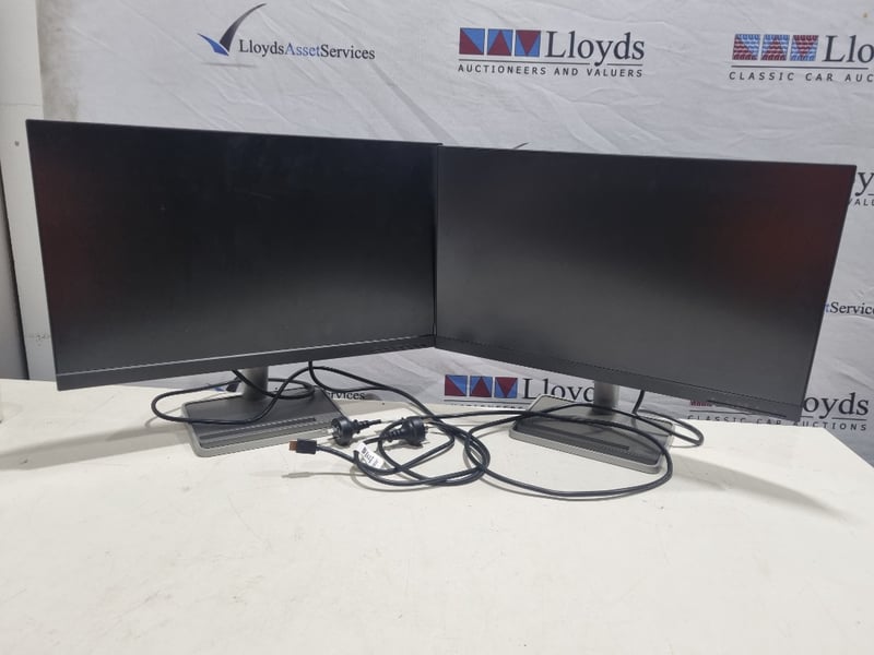 Dual monitor setup comprising two Lenovo L24i-30 LCD displays (Model C20238FL0, manufactured 14/02/2022). Each 24-inch monitor features a flat panel display with grey bezels and integrated stand. Includes original power cables with Australian-style plugs and connection cables. Monitors are in working condition with minor cosmetic wear consistent with auction house handling. Ideal for productivity, trading, or multi-display applications.