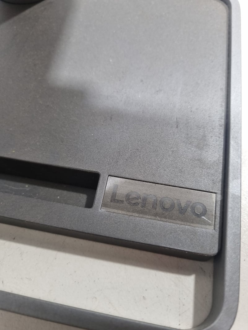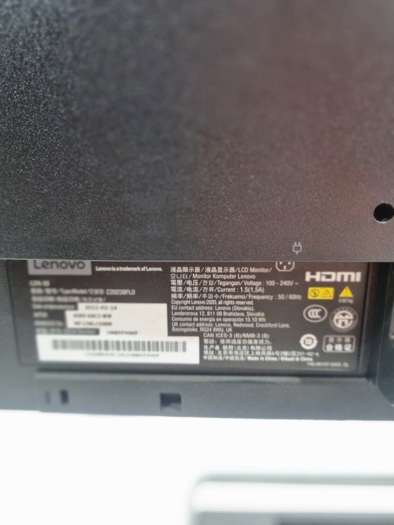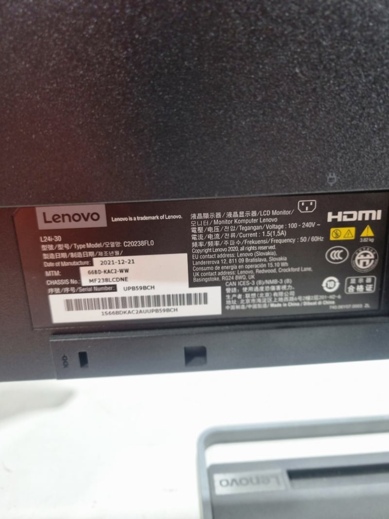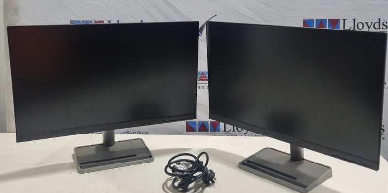 Dual monitor setup comprising two Lenovo LCD displays (24" model C20238FL0, manufactured 21/12/2021). Both monitors feature HDMI connectivity, 1.5A current draw, 50/60Hz frequency compatibility, and 100-240V input voltage range. Includes original stands with cable management and power cords. Displays show minimal cosmetic wear with some dust accumulation on bezels. Both screens power on and display image. Note: untested, signs of wear,only 1 power cord available