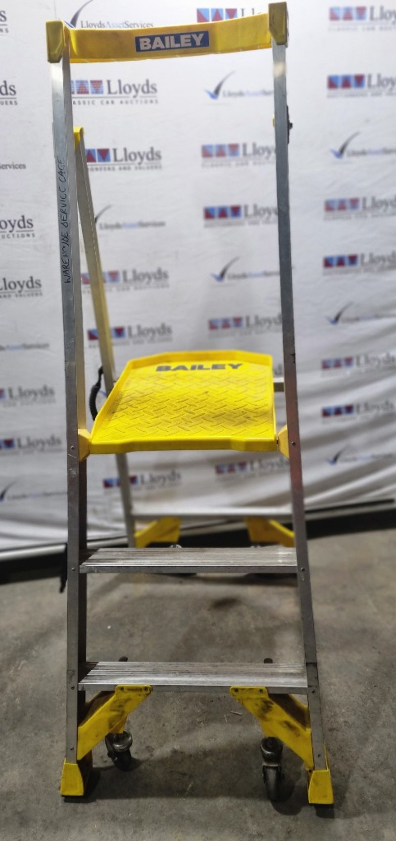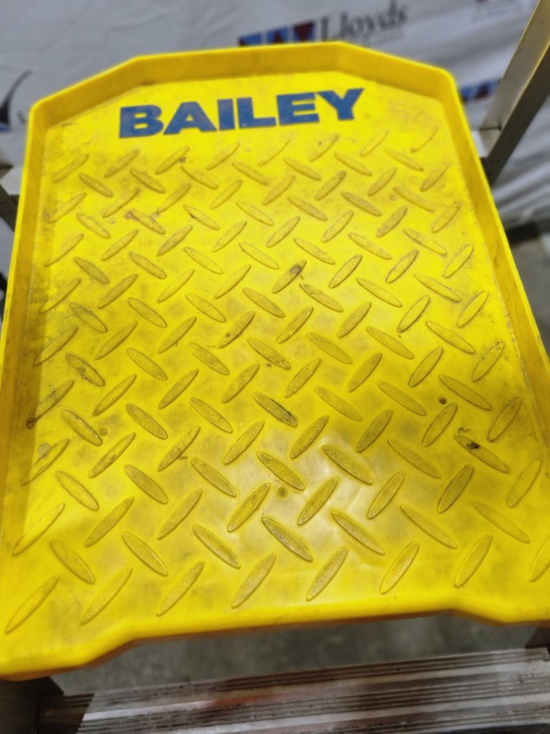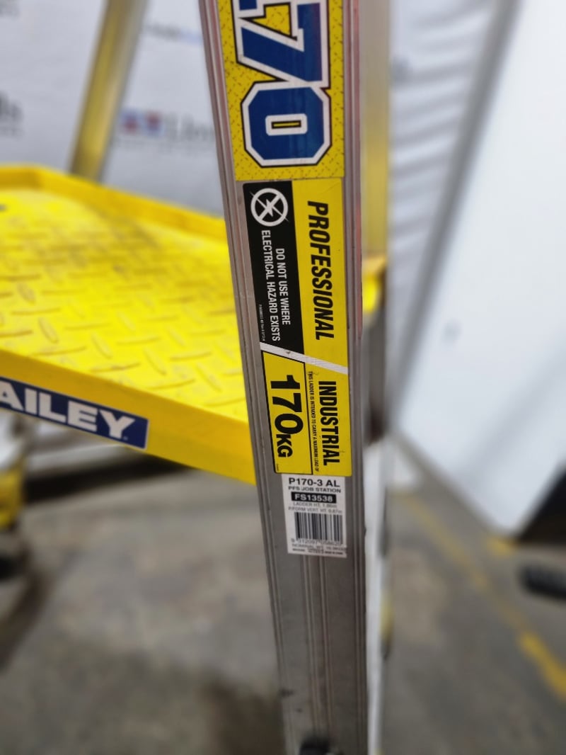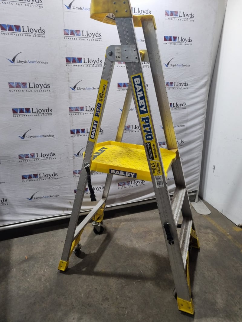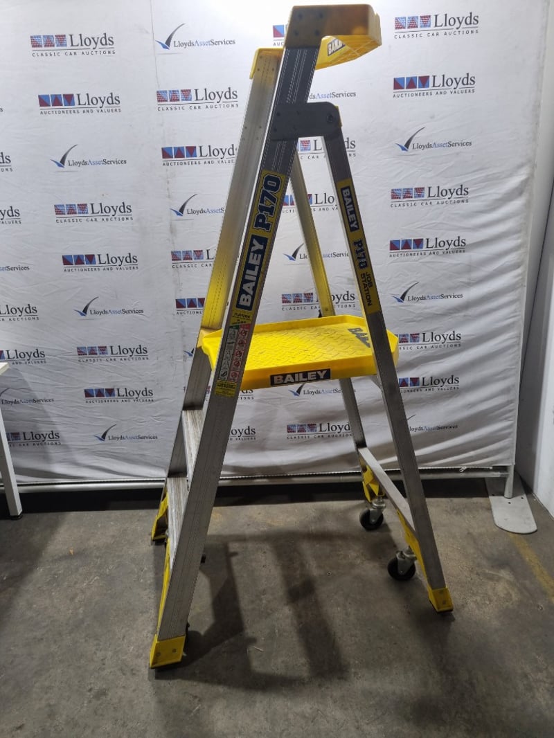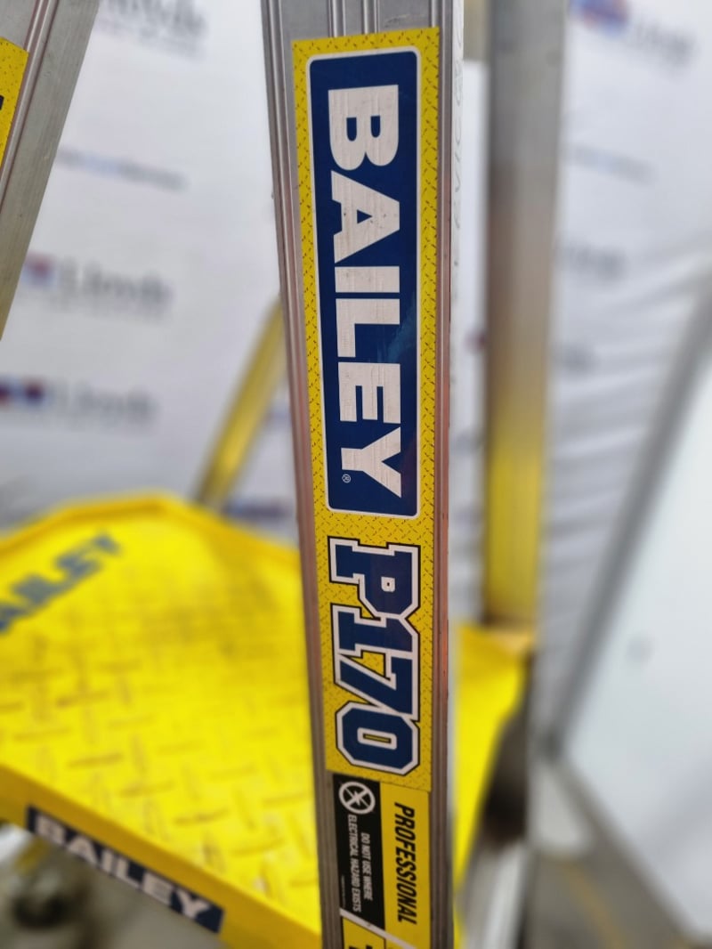Bailey Pro 170-3 AL professional-grade aluminium A-frame ladder. Features robust construction with 3-step configuration, non-slip yellow diamond-plate tread, and lockable castor wheels for mobility. Industrial-duty design with reinforced side rails and safety features. Model P170-3 AL. Note: signs of wear