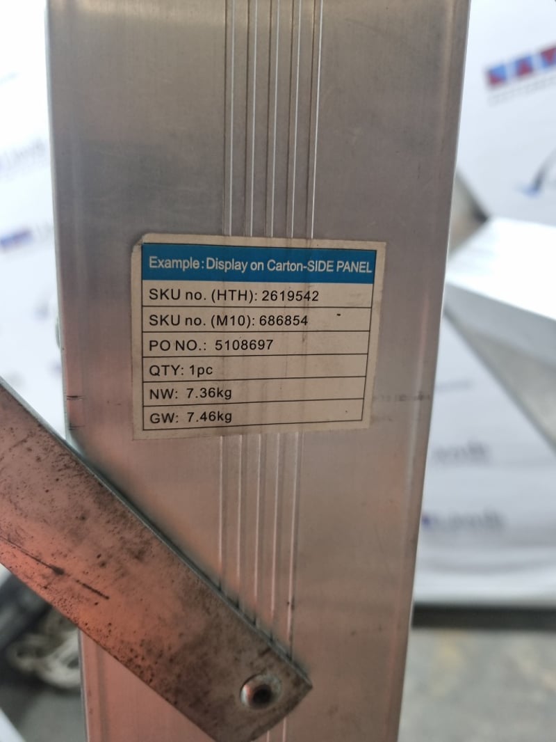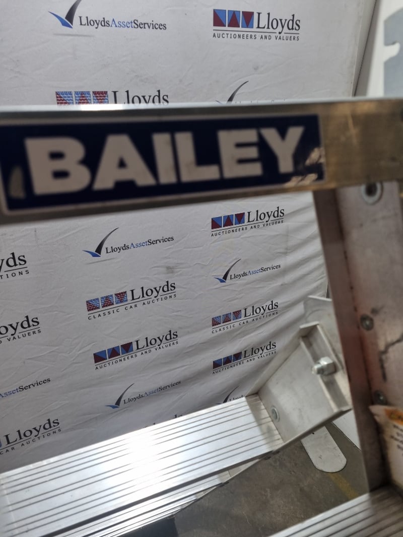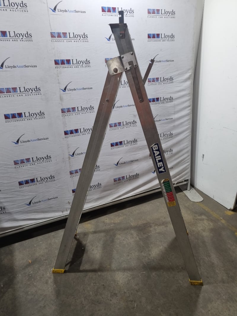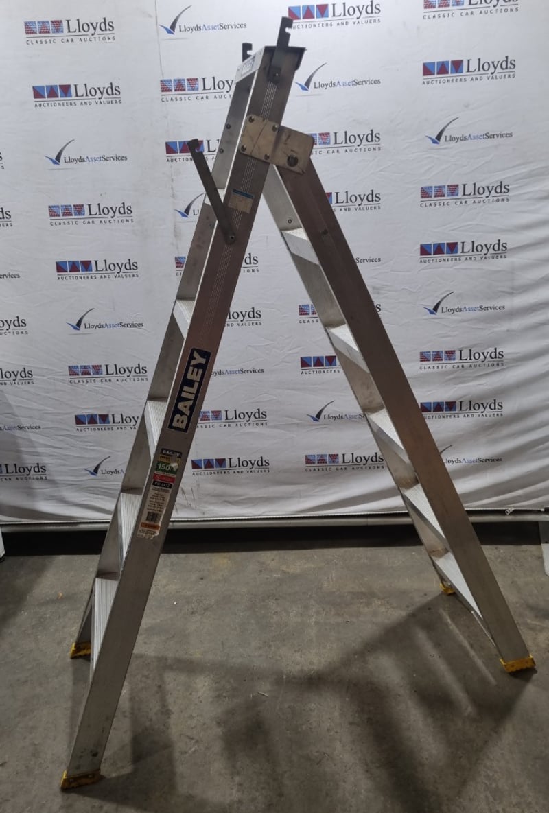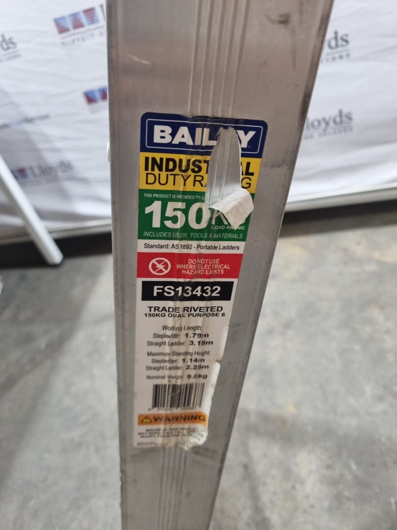 Bailey Industrial Duty trade riveted aluminium A-frame ladder, model FS13432. 150kg load rating dual purpose ladder compliant with AS1892 portable ladder standards. Features trade riveted construction with maximum standing height of 1.14m and straight ladder configuration of 2.28m. Working length 1.79m with stepladder height of 1.79m. Includes user tools and materials. Manufactured from aluminium with brown textured finish. Note: untested, signs of wear