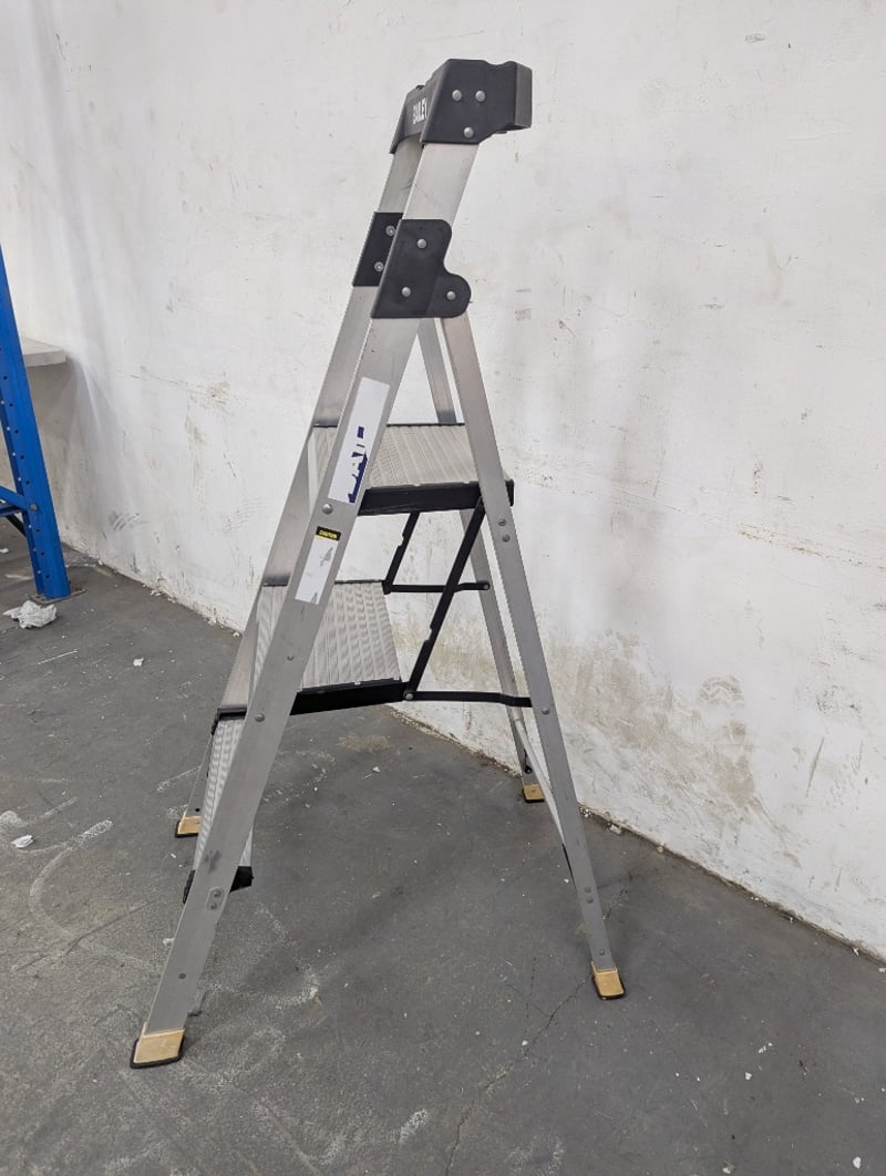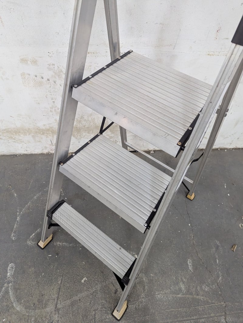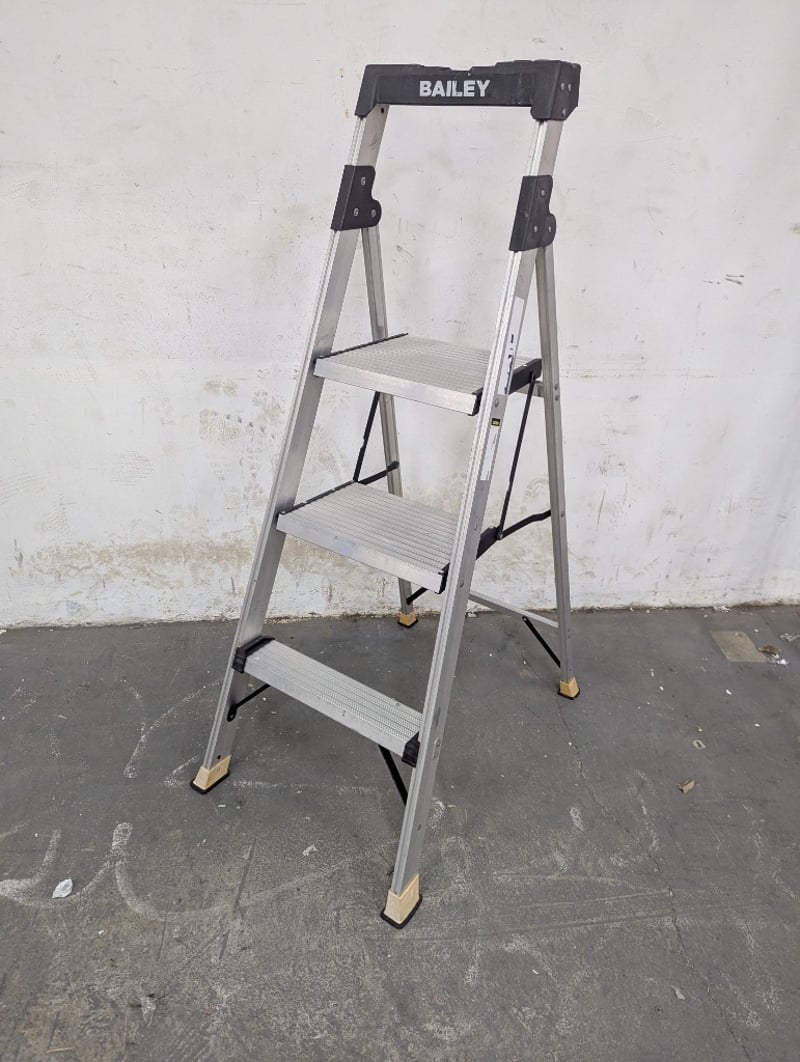 Bailey aluminium A-frame step ladder featuring three wide treads with textured non-slip surfaces.