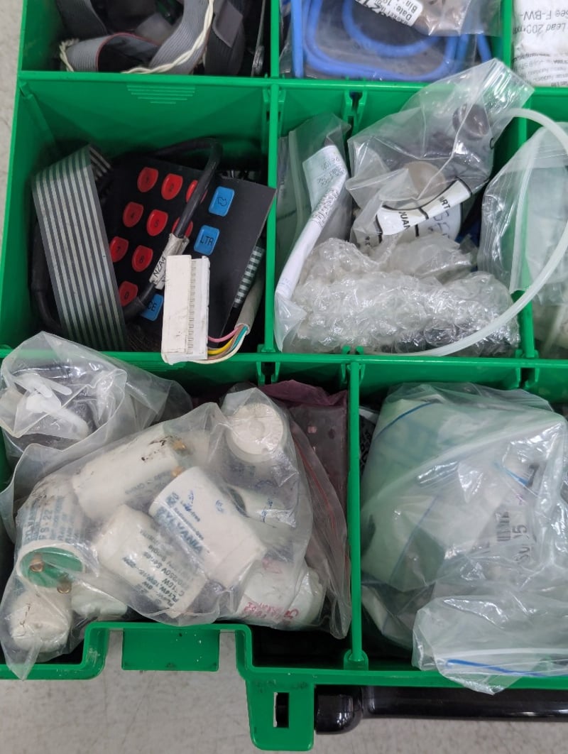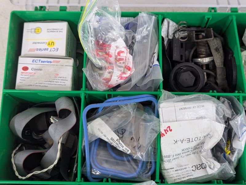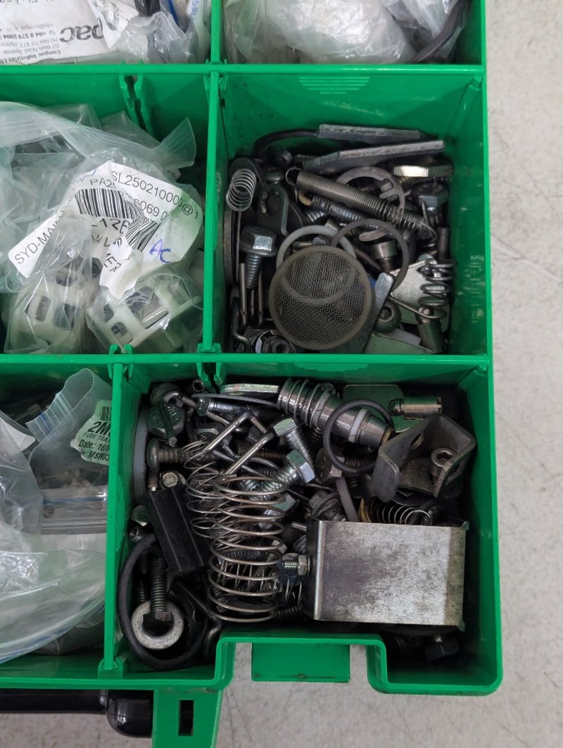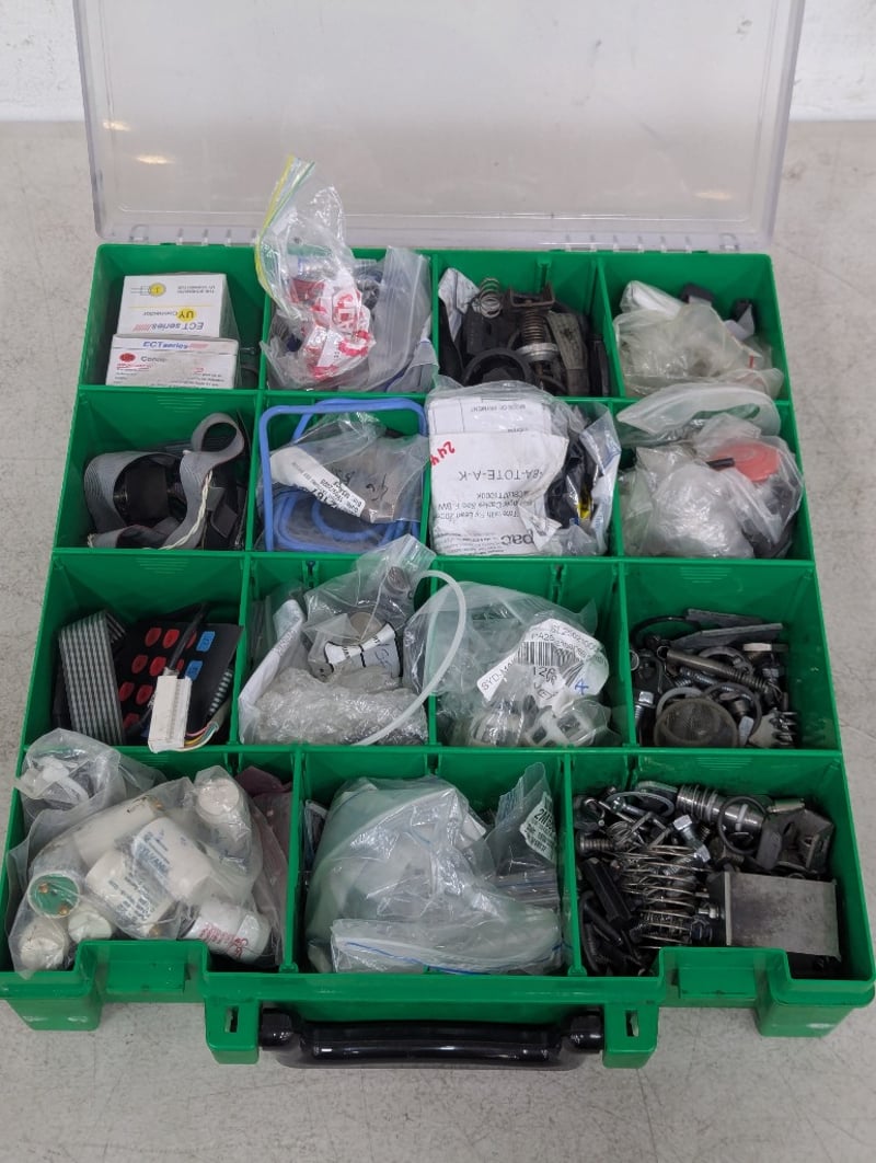 Assorted electrical components, includes springs, screws, light starters and more, in carry caseSOLD AS LOT