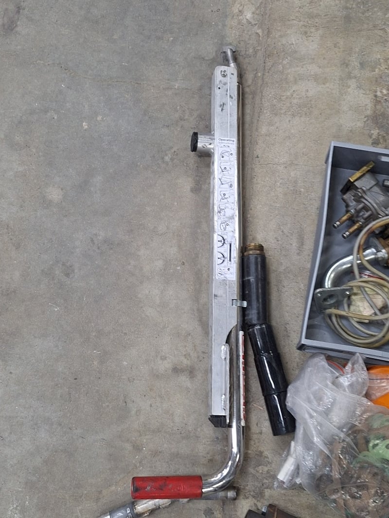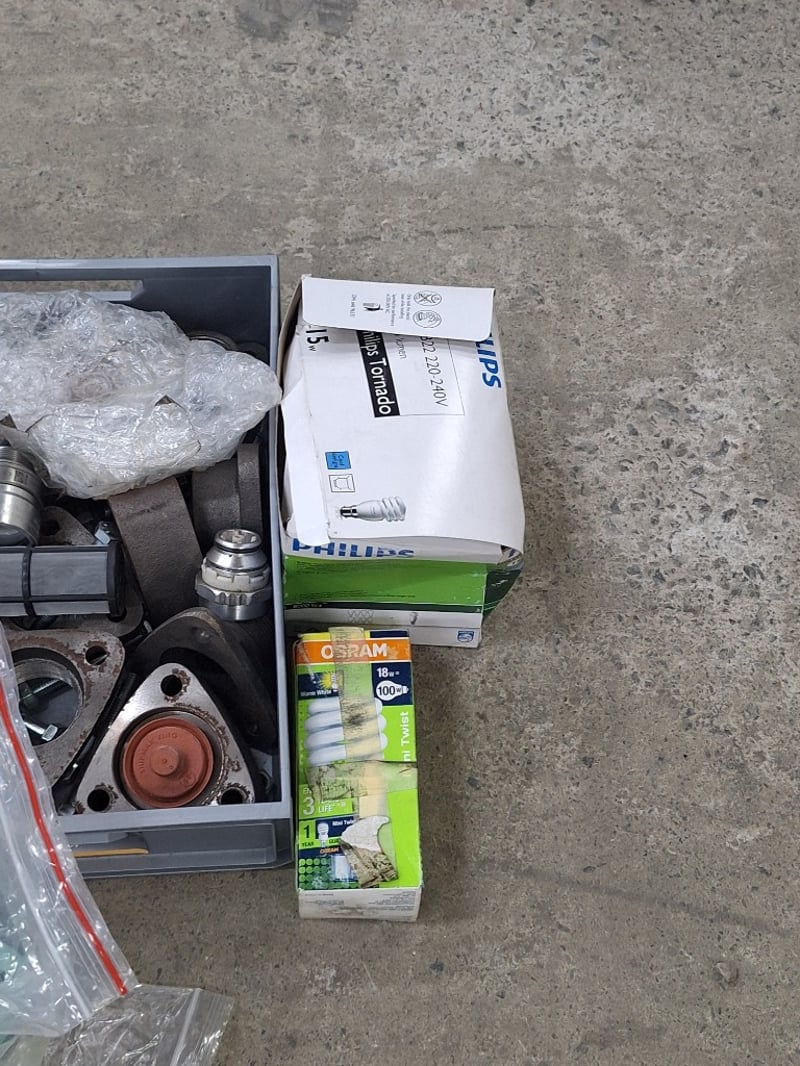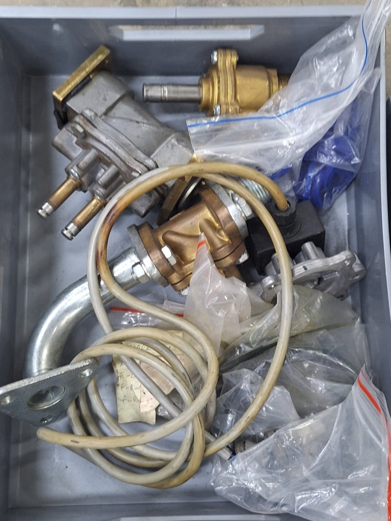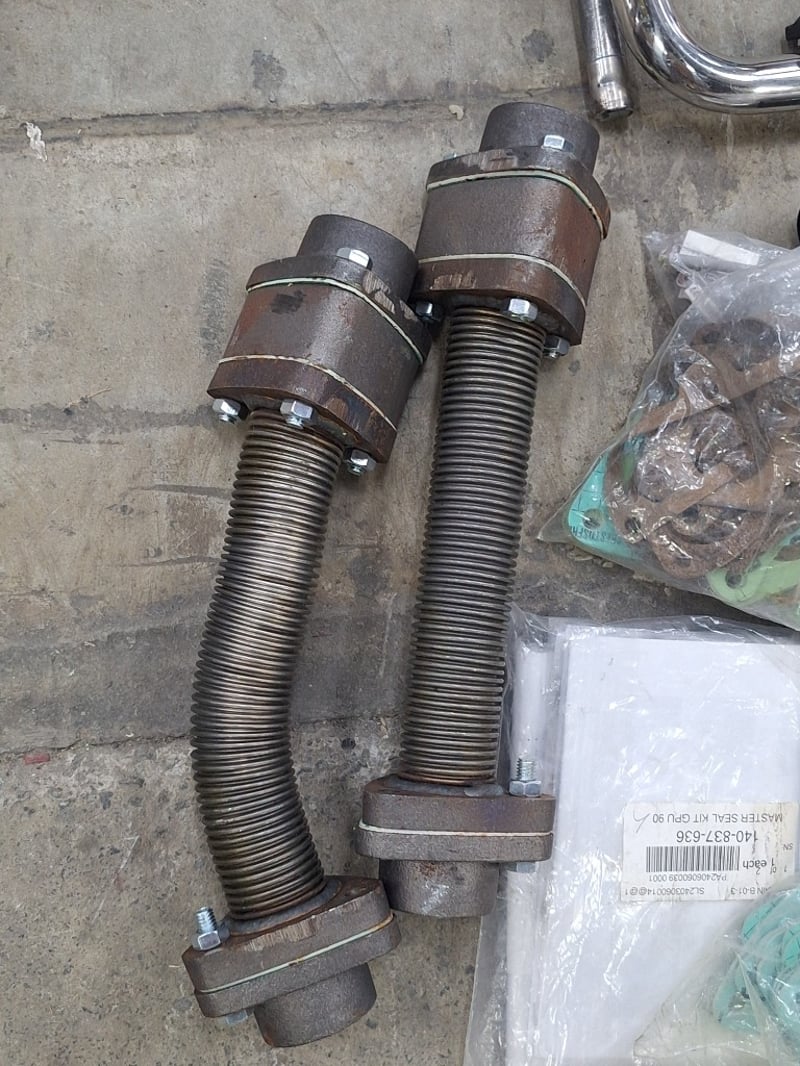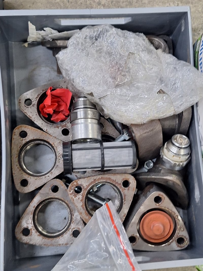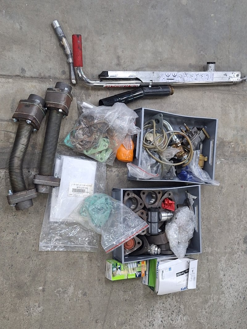 Various Parts and components lot including components, gaskets, and heating/cooling system parts. Features two coil spring assemblies with threaded adjusters, pressure washer lance with red handle and measurement gauge, multiple cylinder head gaskets with brass fittings, thermostat housing units, various brass and steel connectors, hoses, and miscellaneous fasteners. Includes new boxed