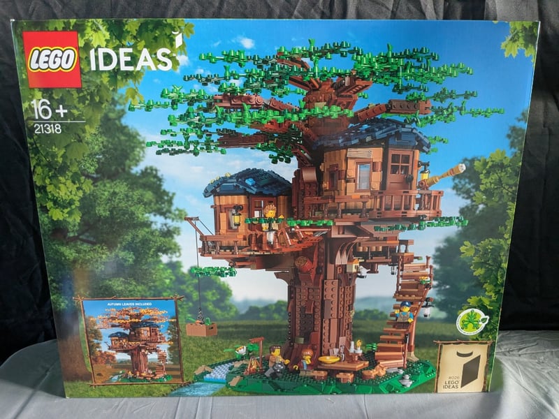 Lego Ideas Set 21318 Featuring An Elaborate Multi-Level Tree House Structure With Modular Wooden Buildings, Expansive Foliage Canopy With Golden-Brown Branches, Detailed Interior Rooms With Furnishings, Minifigures, And Accessories. Includes Rotating Base Platform, Working Pulley System, And Multiple Vignette Scenes. Age Rating 16+. Presented In Original Packaging With Comprehensive Instruction Manual And Component Inventory Visible On Exterior Box.