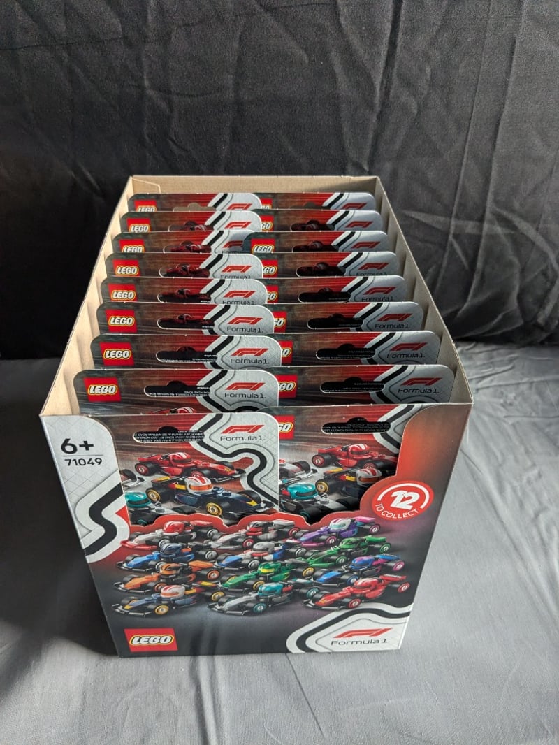 Factory-Sealed Lego Formula 1 Minifigure Collection Display Box Containing 12 Individually Packaged Blind-Bag Minifigures Representing Various F1 Drivers And Teams. Features Original Retail Packaging With Colorful Formula 1 Branding, Collectible Racing Car Designs, And Numbered Series Identification (71049). Box Displays Vibrant Graphics Showcasing The Complete 12-Figure Lineup With Authentic Lego Branding And Formula 1 Licensing. Includes Cardboard Dividers For Organized Storage And Presentatio