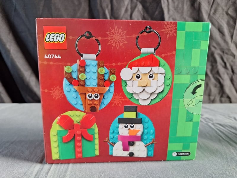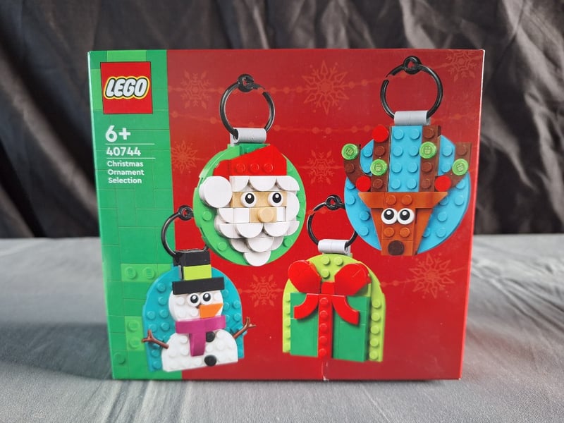 Lego Set 40744 Featuring Four Buildable Christmas Ornaments With Metal Hanging Rings. Includes Santa Face With Green Frame, Reindeer With Blue Wings, Snowman With Top Hat And Scarf, And Wrapped Gift With Red Bow. Complete With Original Packaging And Instruction Materials.