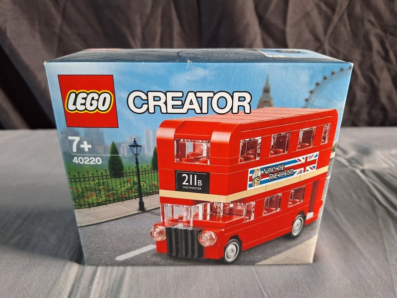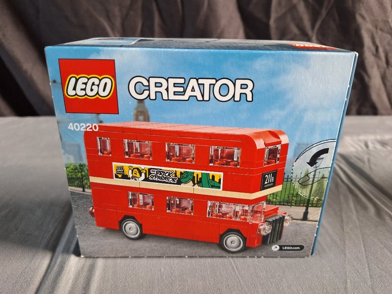 Lego Creator Set 40220 Featuring An Iconic Red London Double-Decker Bus With Detailed Windows, Cream Stripe Detailing, Westminster Route Number Plate, And Authentic British Design Elements. Includes Instruction Manual And Original Retail Packaging With Age Rating 7+.