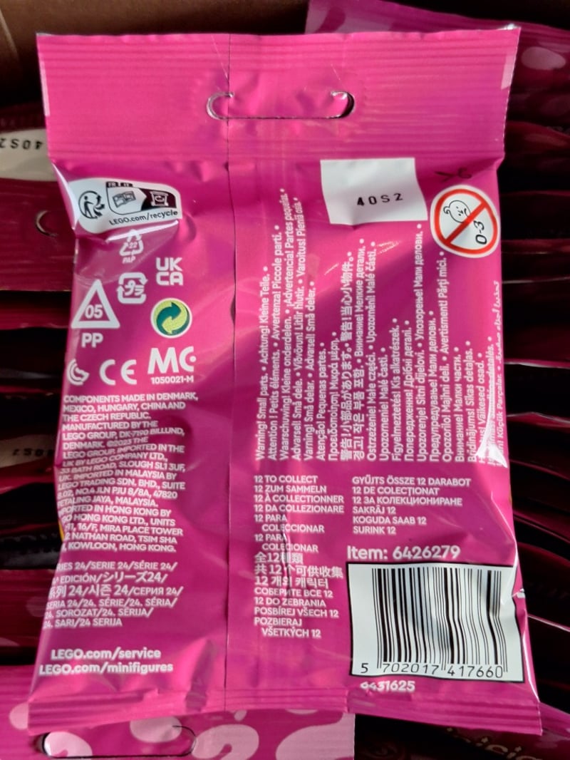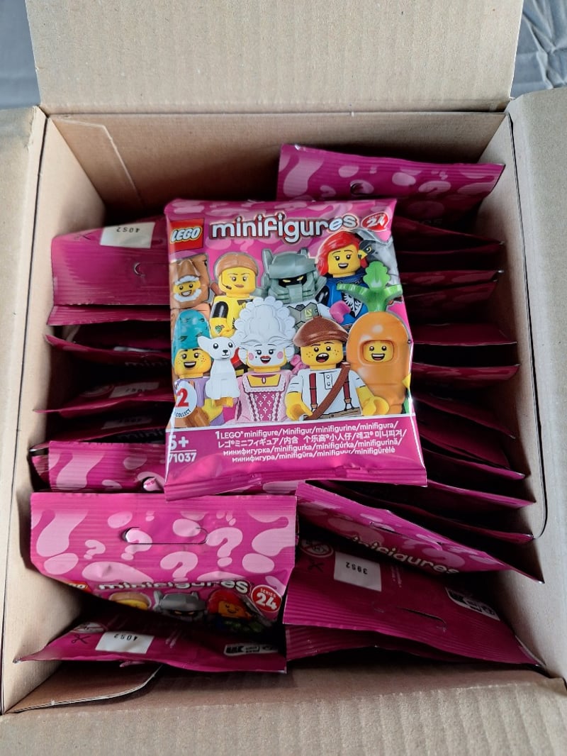 Bulk Lot Of Lego Minifigures Series 24 Sealed Blind Bags (Set #71037). Collection Includes Multiple Unopened Packets Featuring Assorted Minifigure Characters From The Series. Each Bag Contains One Random Minifigure With Accessories. Packaging Displays Vibrant Pink Design With Character Artwork. Includes Collectible Figures Such As Chef, Robot, Ice Cream Vendor, And Various Themed Characters. Original Retail Packaging With Multilingual Text And Barcode Labels Intact. Suitable For Collectors And L