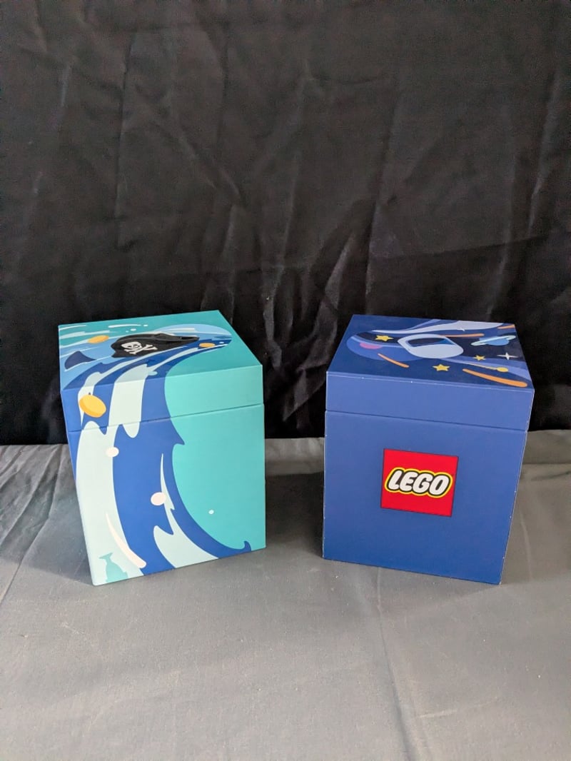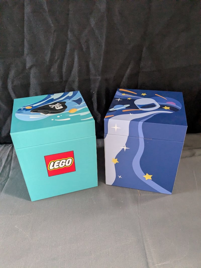 Pair Of Lego-Branded Stackable Storage Boxes Featuring Space-Themed Graphics. Turquoise Box Depicts A Pirate Spaceship With Celestial Elements; Navy Blue Box Showcases A Spacecraft With Stars And Planets. Both Feature Official Lego Branding And Hinged Lids For Secure Closure. Designed For Toy Storage And Display.