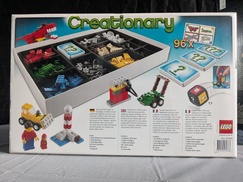 Lego Creationary Is A Creative Building And Guessing Game Featuring Lego Bricks, Minifigures, And 96 Challenge Cards. Players Construct Objects From Lego Elements Based On Category Prompts (Vehicles, Buildings, Animals, Objects) While Others Attempt To Identify Their Creations. The Game Includes A Compartmentalised Storage Tray With Organised Brick Sections, A Colour-Coded Die, Instruction Booklets In Multiple Languages, And A Comprehensive Set Of Lego Components. Gameplay Accommodates 2-4 Playe