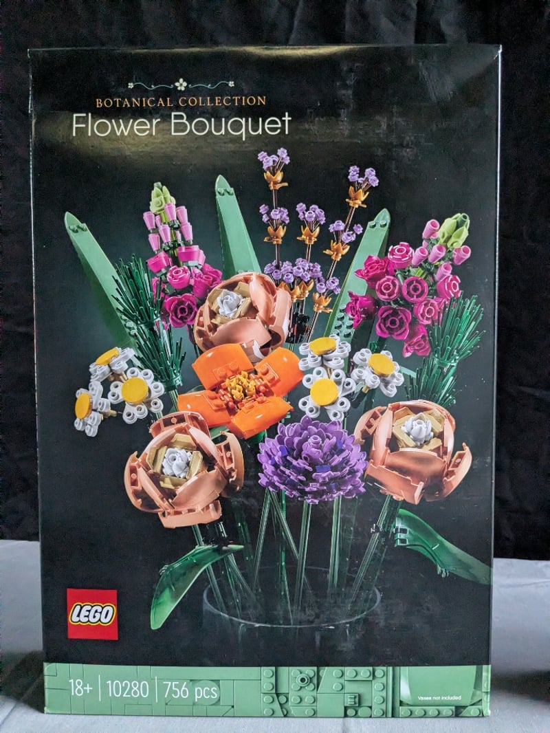 Lego Botanical Collection Flower Bouquet (Set 10280) Featuring 756 Pieces. Buildable Floral Arrangement Includes Pink Roses, Purple Peonies, Orange Blossoms, White Daisies With Yellow Centres, And Decorative Green Foliage Stems. Designed For Ages 18+. Includes Clear Glass Vase Display Base. Unassembled Set In Original Packaging With Visible Wear To Box Exterior.