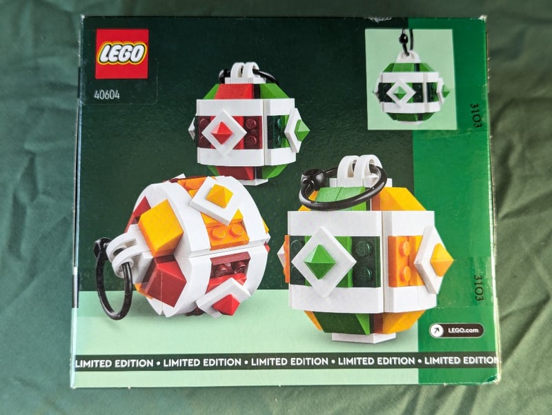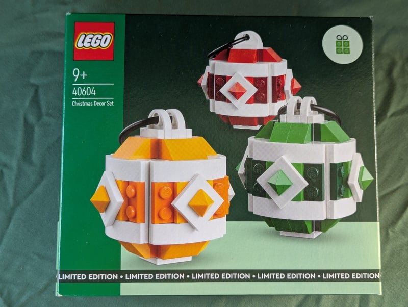 Lego Set 40604 Featuring Three Buildable Christmas Ornament Baubles In Red, Green, And Orange Colorways. Each Spherical Decoration Showcases Geometric Diamond Patterns With White Bands And Includes Hanging Loops. Marked As Limited Edition. Suitable For Ages 9+. Includes Instruction Manual And Original Packaging.