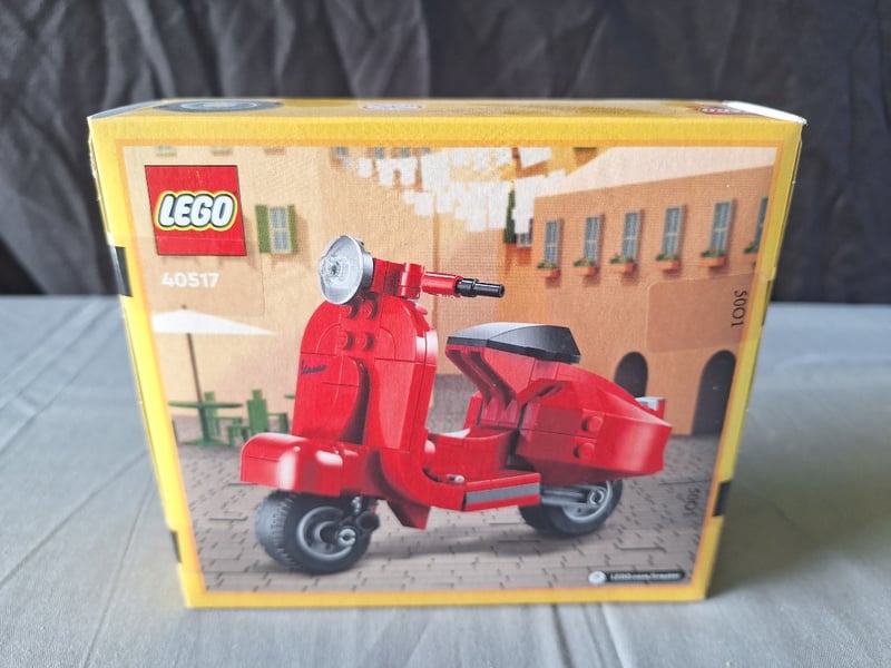 Lego Creator Vintage-Style Red Vespa Scooter Building Set (40517) Featuring Detailed Brick Construction Of An Iconic Italian Motor Scooter With Working Headlight, Sidecar Attachment, And Authentic Period Architecture Backdrop. Suitable For Ages 9+. Includes Original Retail Packaging With Blue And Yellow Box Design Displaying Assembled Model And Scenic Mediterranean Townscape Setting.