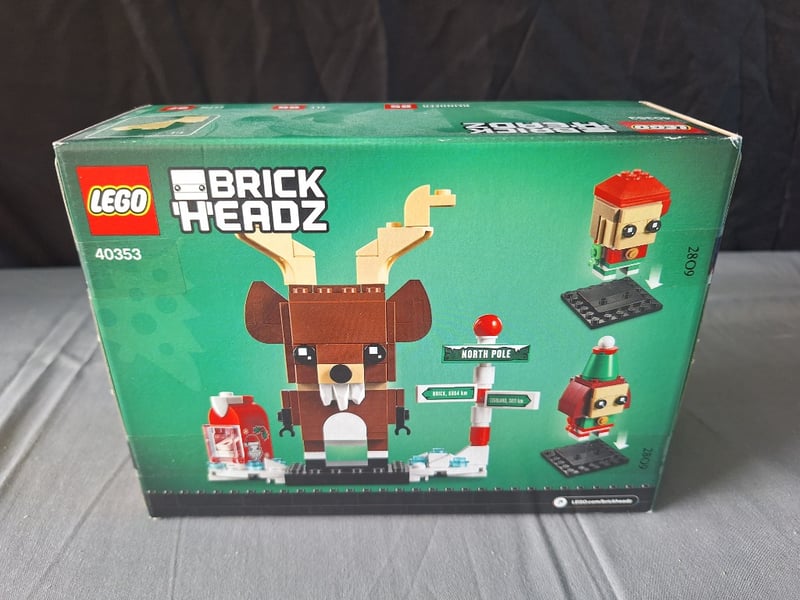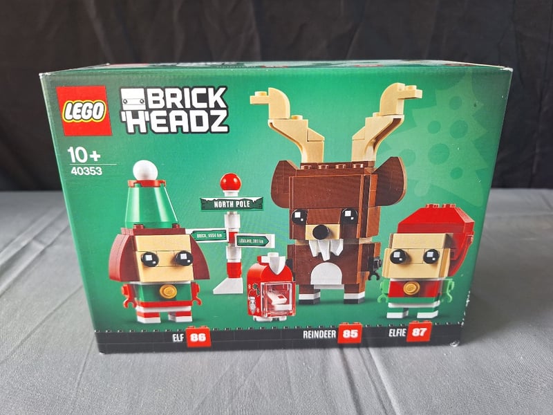 Lego Brickheadz Set 40353 Featuring Buildable Brick-Constructed Character Heads Of A Reindeer With Articulated Antlers And Two Festive Elves In Red And Green Holiday Attire. Set Includes North Pole Signage And Accessory Elements. Recommended For Ages 10+. Original Retail Packaging With Printed Graphics Showing All Three Characters And Assembly Details Visible On Box Sides.