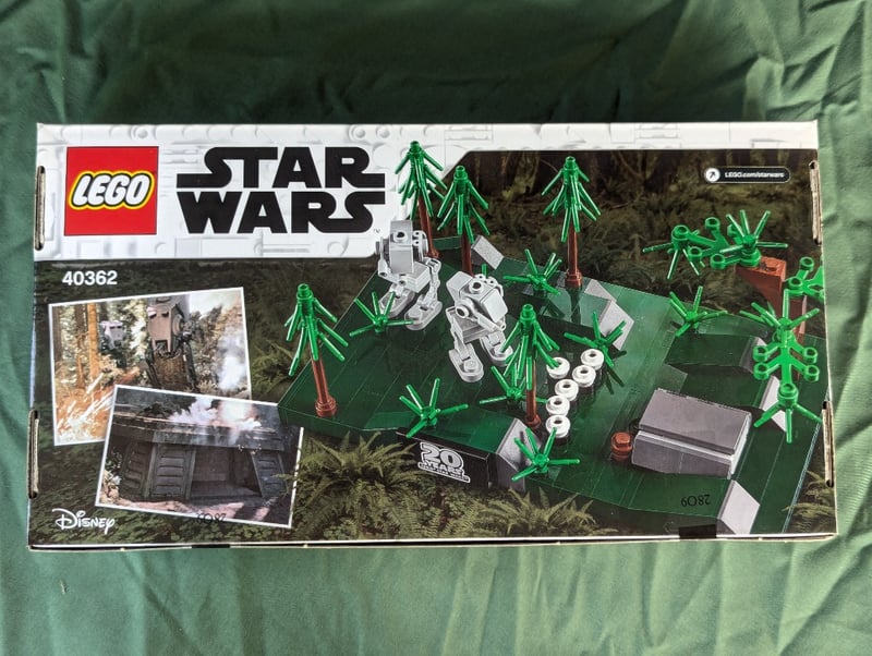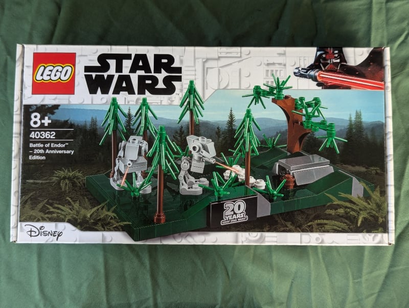 Lego Star Wars Set 40362 Commemorating The 20Th Anniversary Of The Battle Of Endor. Features Minifigure-Scale At-St Walkers, Ewok Village Forest Environment With Green Trees, Brown Wooden Structures, And Detailed Base Platform. Includes Multiple Minifigures And Accessories. Sealed In Original Factory Packaging With Printed Box Artwork Depicting Forest Battle Scene And Darth Vader Imagery.