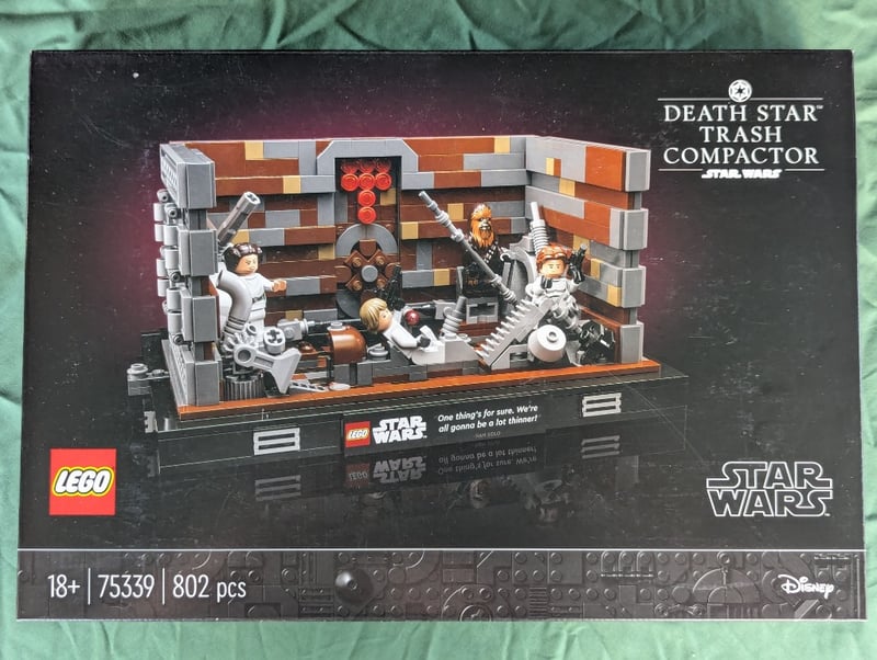 Lego Star Wars Death Star Trash Compactor Set (75339) With Minifigures Including Han Solo, Chewbacca, Princess Leia, And Luke Skywalker. Includes Detailed Brick-Built Trash Compactor Chamber With Orange And Grey Architectural Detailing, Red Spherical Elements, And Functional Compactor Mechanism. Adult-Oriented Collectible Set (18+) With Display Base. Unopened, Factory-Sealed Condition.