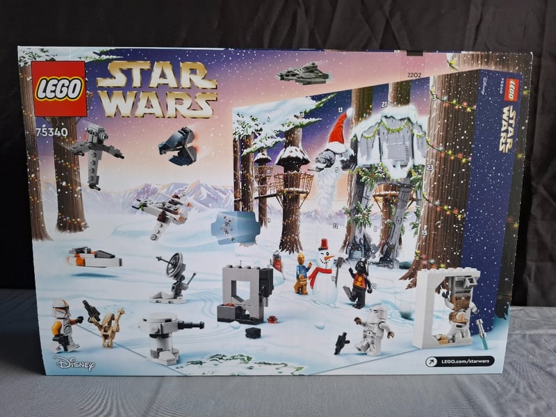 LEGO STAR WARS ADVENT CALENDAR 75340Lego Star Wars Advent Calendar Set 75340 Featuring 24 Daily Gifts With Star Wars-Themed Minifigures And Spacecraft. Box Displays Festive Winter Scene With Decorated Trees, Snow-Covered Landscape, And Iconic Star Wars Vehicles Including Tie Fighters And X-Wing Starfighters. Set Includes Multiple Minifigures, Buildable Models, And Accessories. Original Retail Packaging With Disney Branding Visible. Suitable For Ages 6+.Condition: Good - Refer To Images584570+428