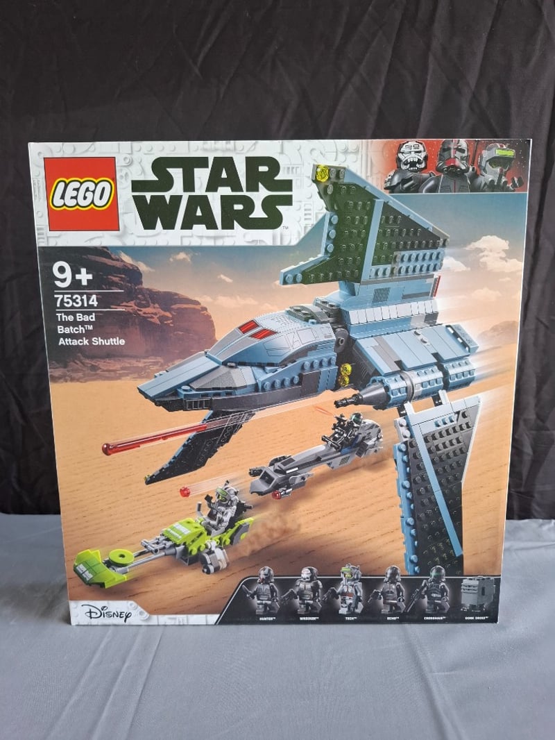 LEGO STAR WARS 75314 THE BAD BATCH ATTACK SHUTTLE SETLego Star Wars Set 75314 Featuring The Bad Batch Attack Shuttle. This 9+ Age-Rated Set Includes A Detailed Blue And Grey Shuttle Craft With Opening Cockpit And Cargo Bay, An Articulated Dark Side Fighter, A Lime-Green Speeder Vehicle, And Six Minifigures (Hunter, Wrecker, Tech, Crosshair, Echo, And A Stormtrooper).Condition: Good - Refer To Images584570+434