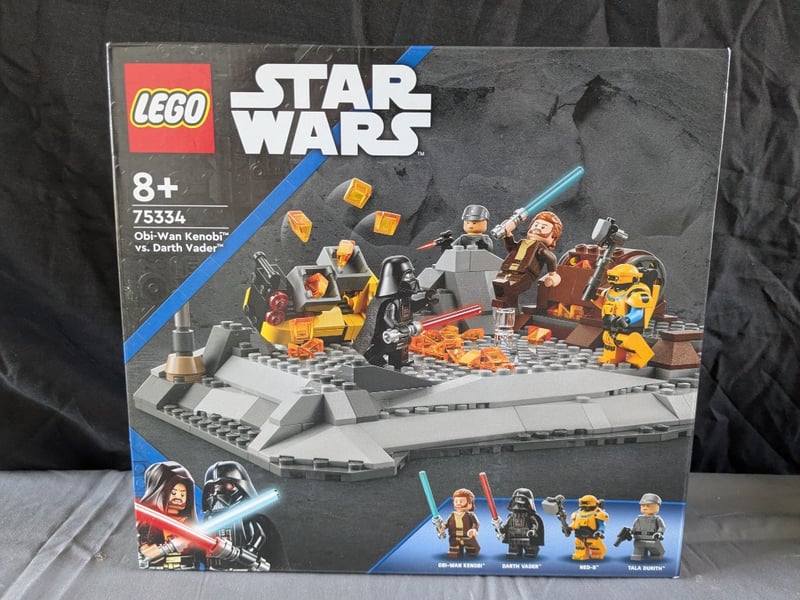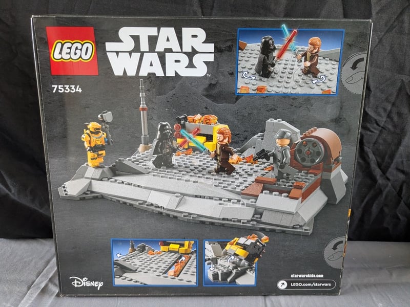 Lego Star Wars Set 75334 Featuring The Iconic Duel Between Obi-Wan Kenobi And Darth Vader. Includes Minifigures Of Obi-Wan Kenobi, Darth Vader, Tala Durith, And An Imperial Stormtrooper. Set Comprises A Detailed Diorama Base With Platform Elements, Lightsaber Accessories In Blue And Red, And Various Thematic Pieces Including Cargo Containers And Equipment. Recommended For Ages 8+. Unopened, Factory-Sealed Condition With Original Retail Packaging Intact.