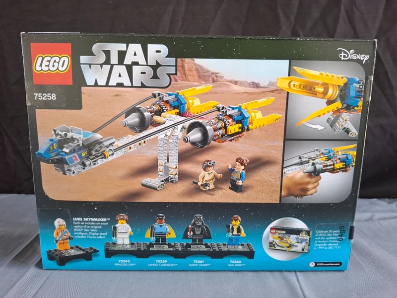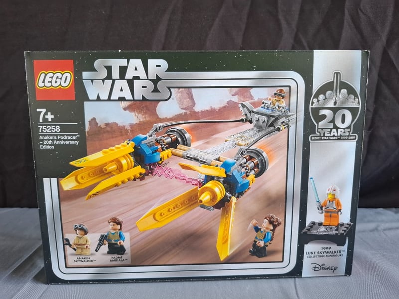 Lego Star Wars Set 75258 Featuring Anakin'S Podracer In 20Th Anniversary Edition Packaging. Includes Yellow And Blue Podracer With Dual Engines, Minifigures Of Anakin Skywalker And Padmé Amidala, Plus Exclusive 1999 Luke Skywalker Collectible Minifigure. Original Sealed Box With Detailed Desert Scene Imagery And Technical Specifications Visible On Packaging.