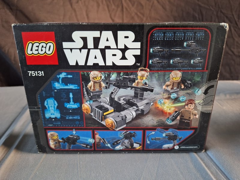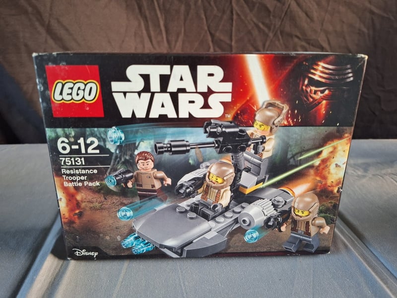 Lego Star Wars Set 75131 Featuring Resistance Trooper Battle Pack With Four Minifigures, Speeder Vehicle, Weapons, And Accessories. Original Packaging Shows Age-Related Wear With Visible Creasing And Corner Damage. Set Appears Complete Based On Box Imagery Showing All Components. Designed For Ages 6-12.