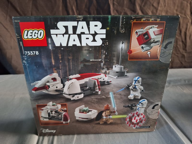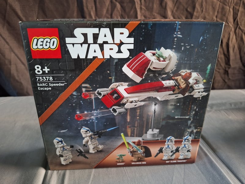 Lego Star Wars Set 75378 Featuring The Barc Speeder Escape Scene. Includes Buildable Red And White Barc Speeder With Detachable Escape Pod, Minifigures (Grogu, Hellsbar Droid, Clone Troopers), And Accessories. Age 8+. Original Packaging Shows Minor Wear Consistent With Display And Storage.