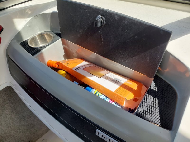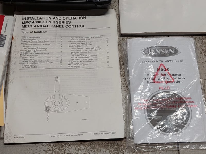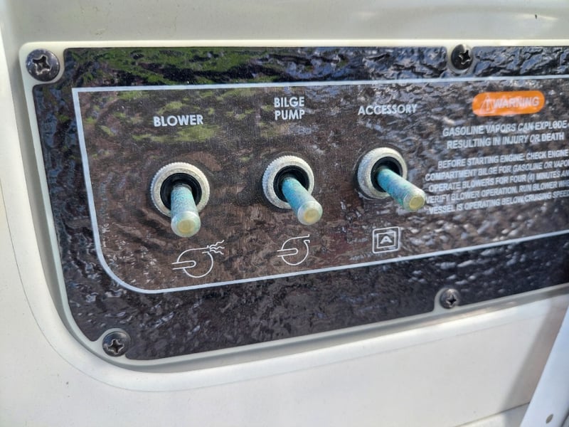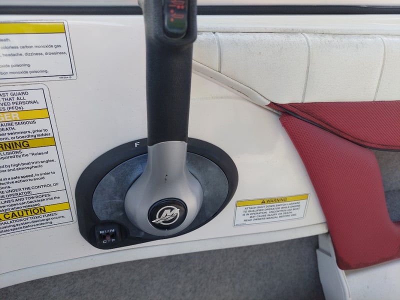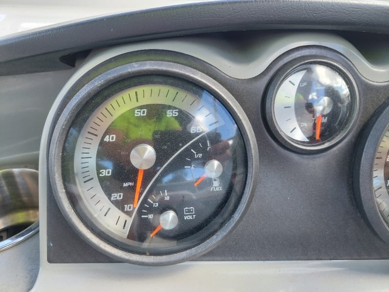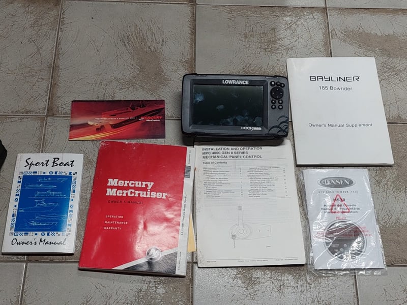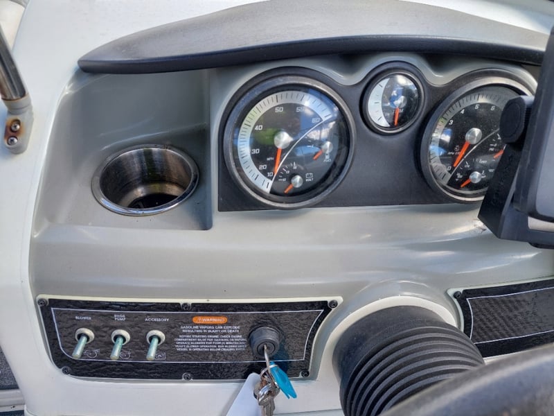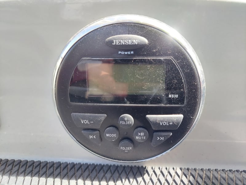 Description: Inboard engine prop trim not functioning (unknown working condition), Rear swim deck platform, Bimini, Lowrance Sounder, Blower, Bilge Pump, Accessory Switch, MP3 Auxiliary Input, Jensen MS30 radio, Life Jackets, Anchor with rope & chain, boat cover, battery isolator.
