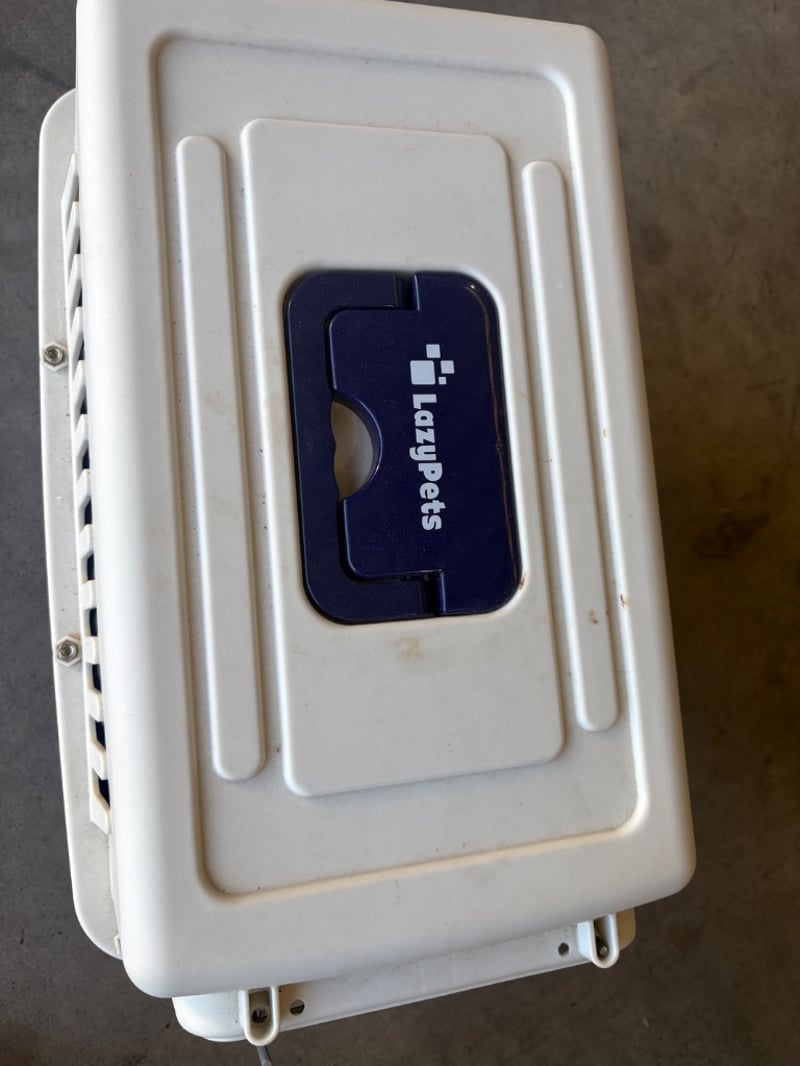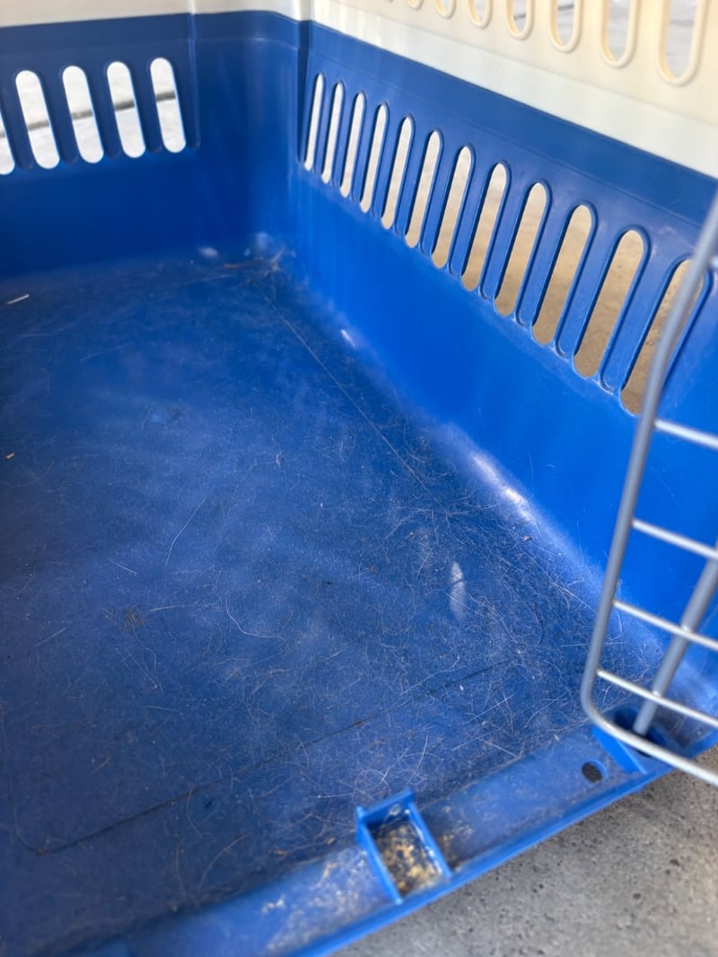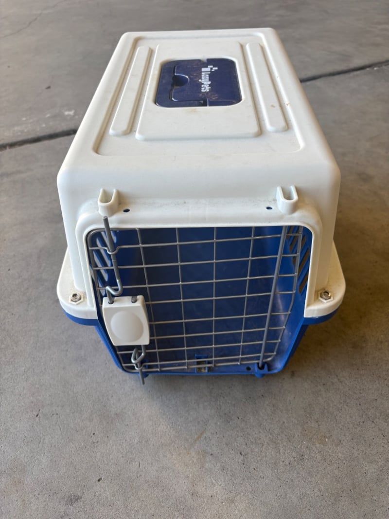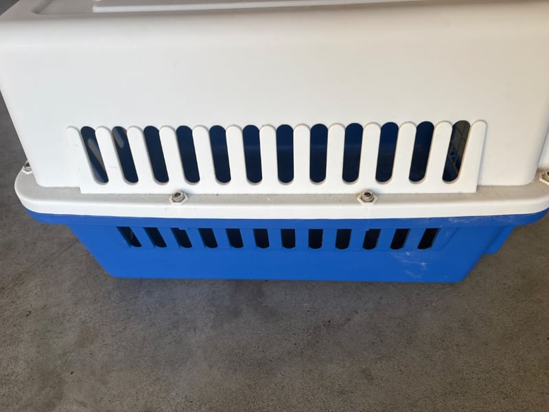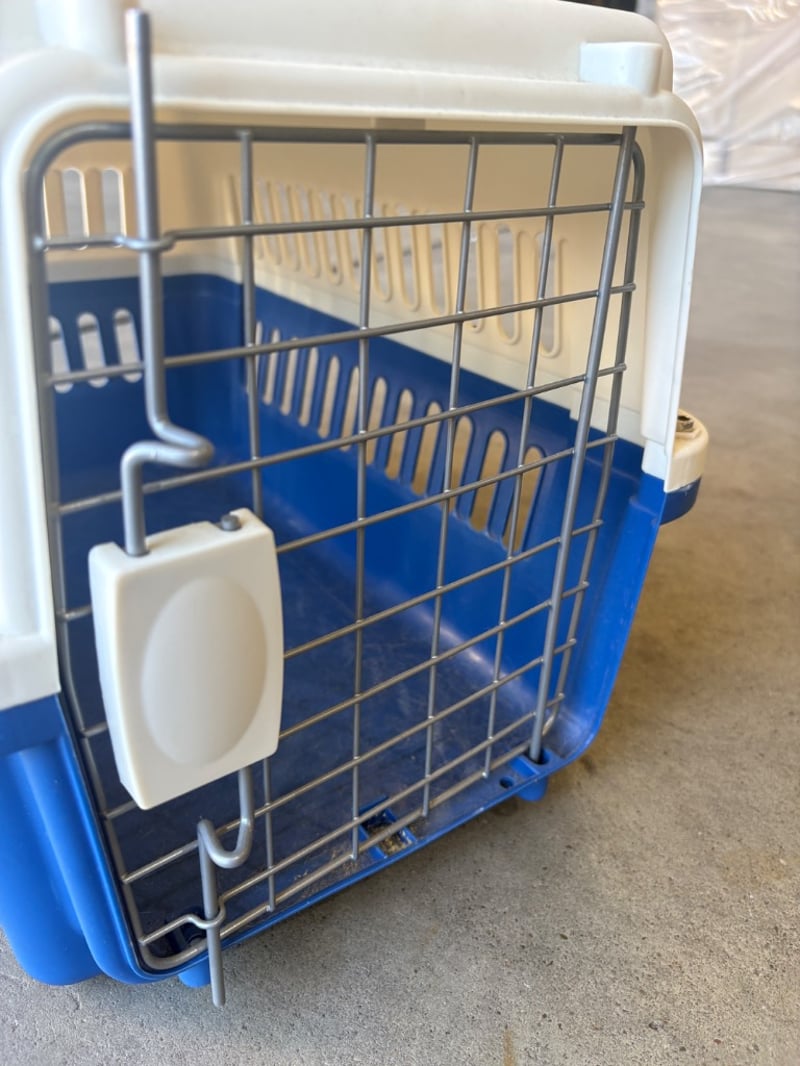 Small Pet Carrier, LazyPets, Blue and White with Lockable Door Will need to be cleaned out Dimensions: H32cm W30cm D50cm