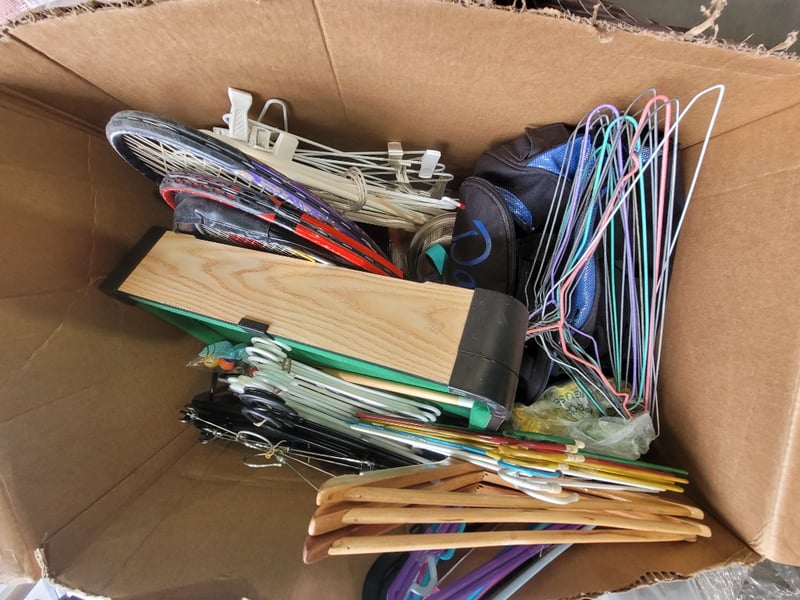 Box of Assorted Items Description: Items Include, x3 seat cushions, coat hangers, tennis rackets, and more. Note used, marks and wear.