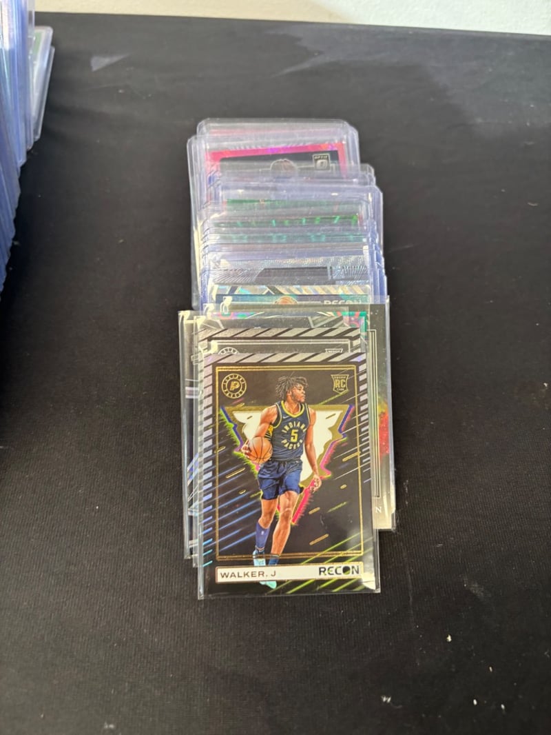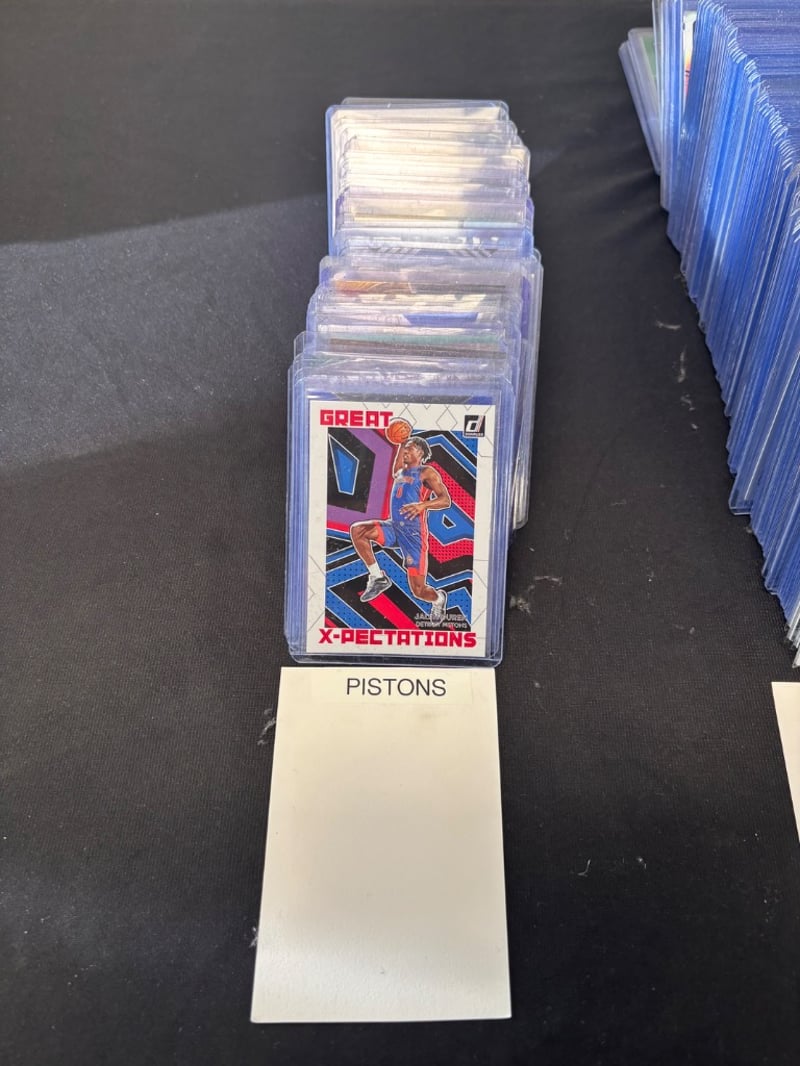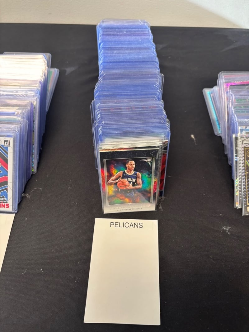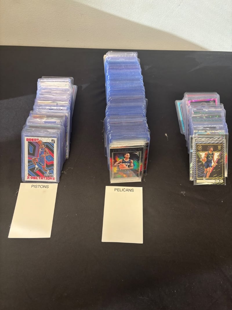 Curated Collection Of Basketball Trading Cards Organized By Team In Clear Protective Sleeves. Features Detroit Pistons Collection (Approximately 15-20 Cards Including Vintage Great Expectations Series), New Orleans Pelicans Collection (Approximately 30+ Cards With Modern Holographic Finishes), And Miscellaneous Player Cards Including Jayson Tatum And Other Contemporary Athletes. Cards Displayed In Labeled Acrylic Holders With Organized Categorization System. Mix Of Vintage And Modern Card Stock