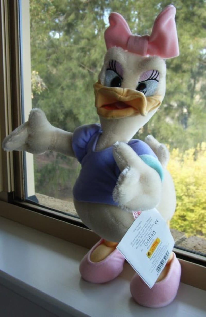 The Steiff Daisy Duck (Ean 651823) Is A Limited Edition Plush Of 3000 From The 2001 Disney Showcase Collection, White Short Mohair, Blue And Pink Embroidered Eyes, Black Pupils, Purple Shirt, Yellow Fabric Legs And Bill, Top And Bottom Bills Are Wired Along With Arms And Legs For Posing, Pink Fabric High Heels, Pink Fabric Hair Bow. Features The Gold-Plated "Button In Ear" Tag And Certificate Retail Was $1200 No 590/3000