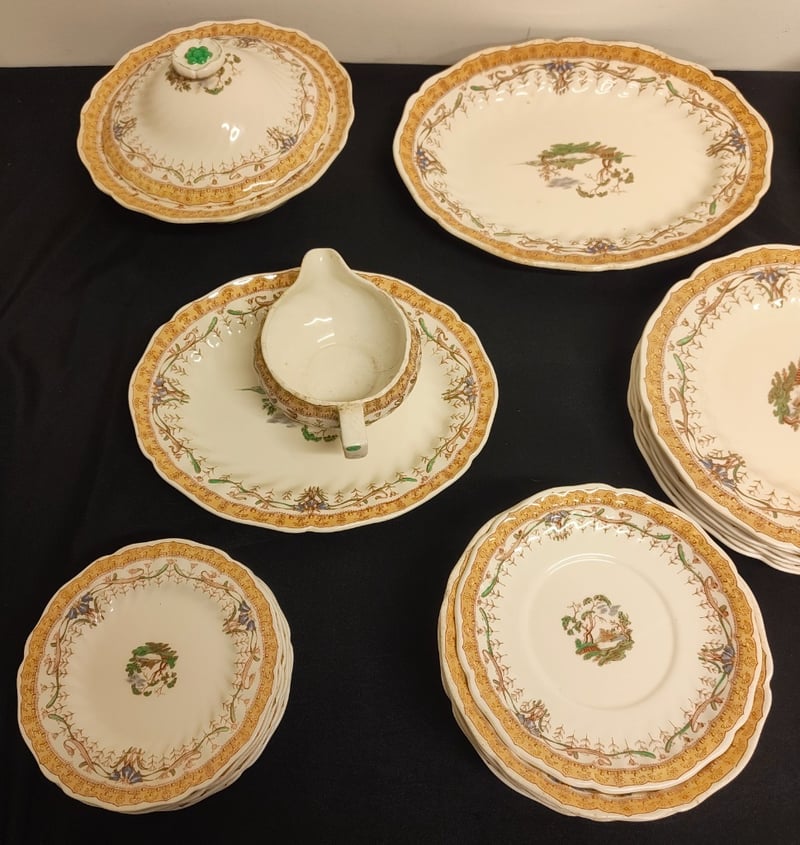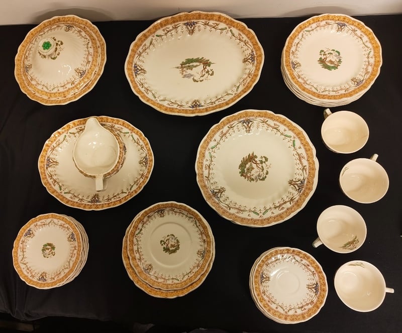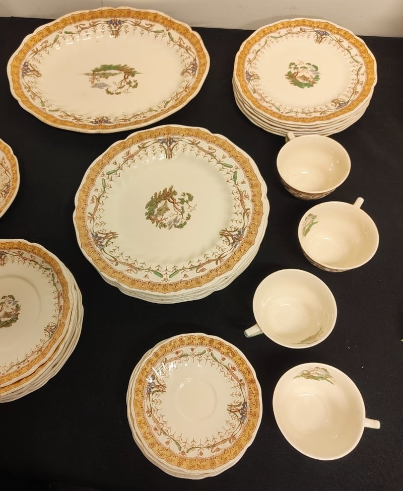 SET OF PATTERNED GLASSWARE, INCLUDING PLATES, BOWLS, CUPS AND MORE